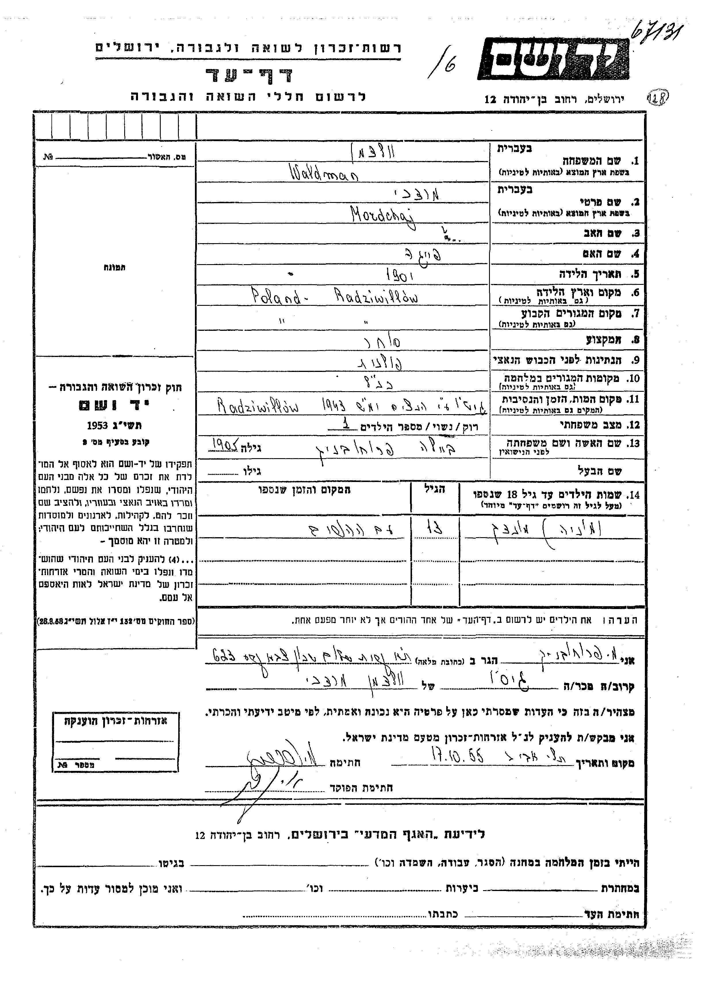 Вальдман Моня Радивилов, Польша Лист свидетельских показаний