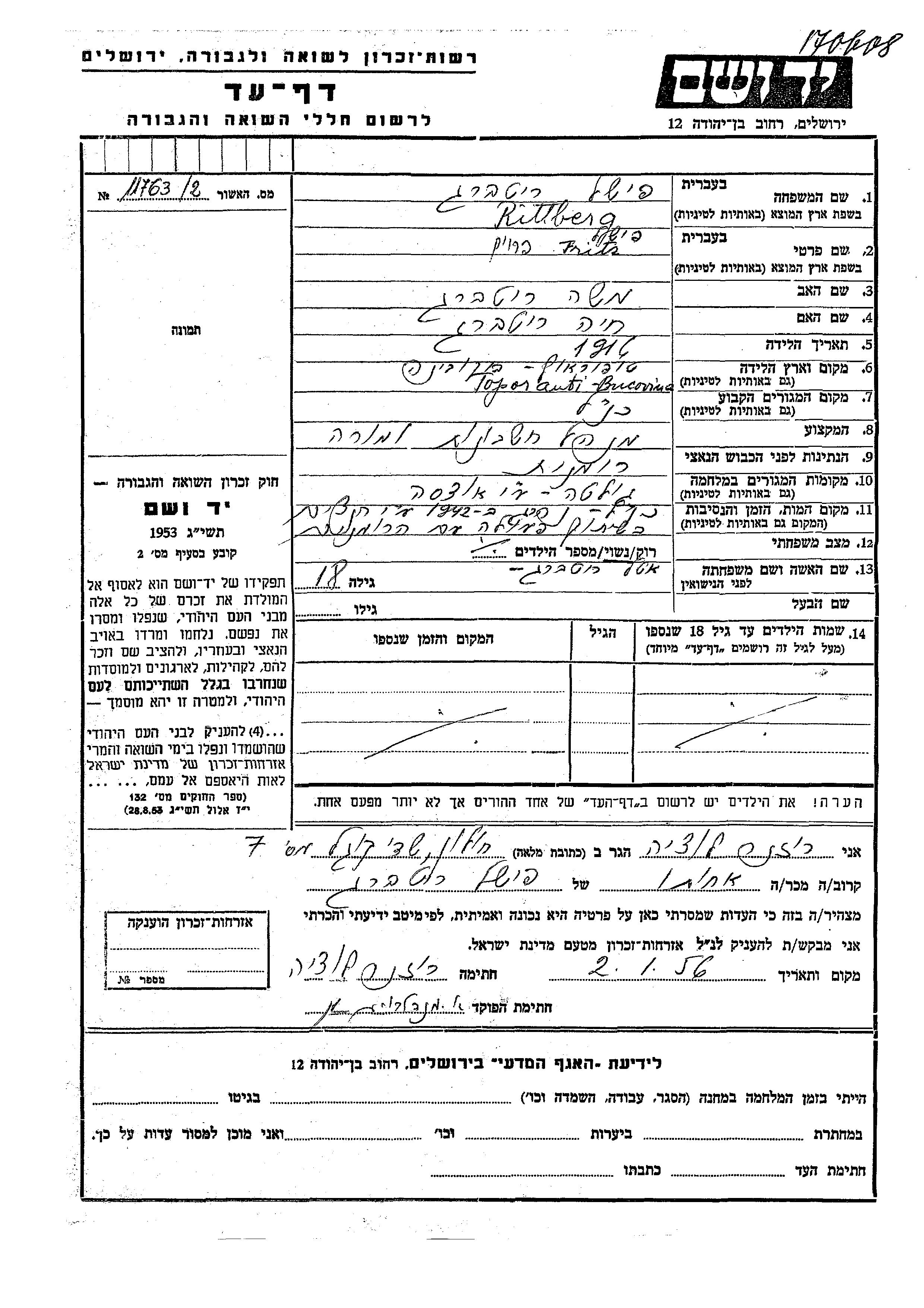 Риттберг Фриц Фроим Фишель 1916 Топорэуць, Румыния Лист свидетельских показаний