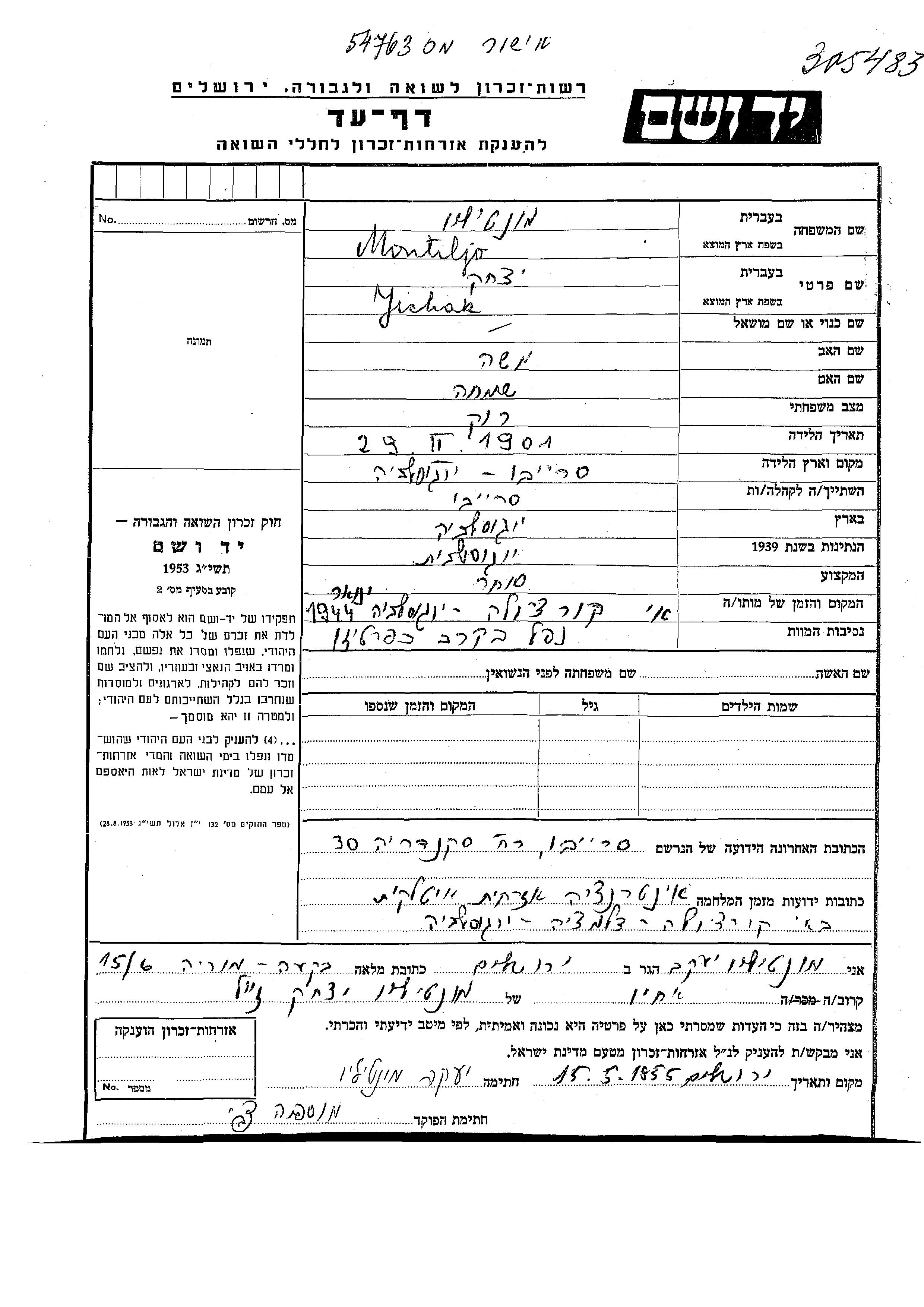 Монтильо Ицхак 1901 Сараево, Югославия Лист свидетельских показаний