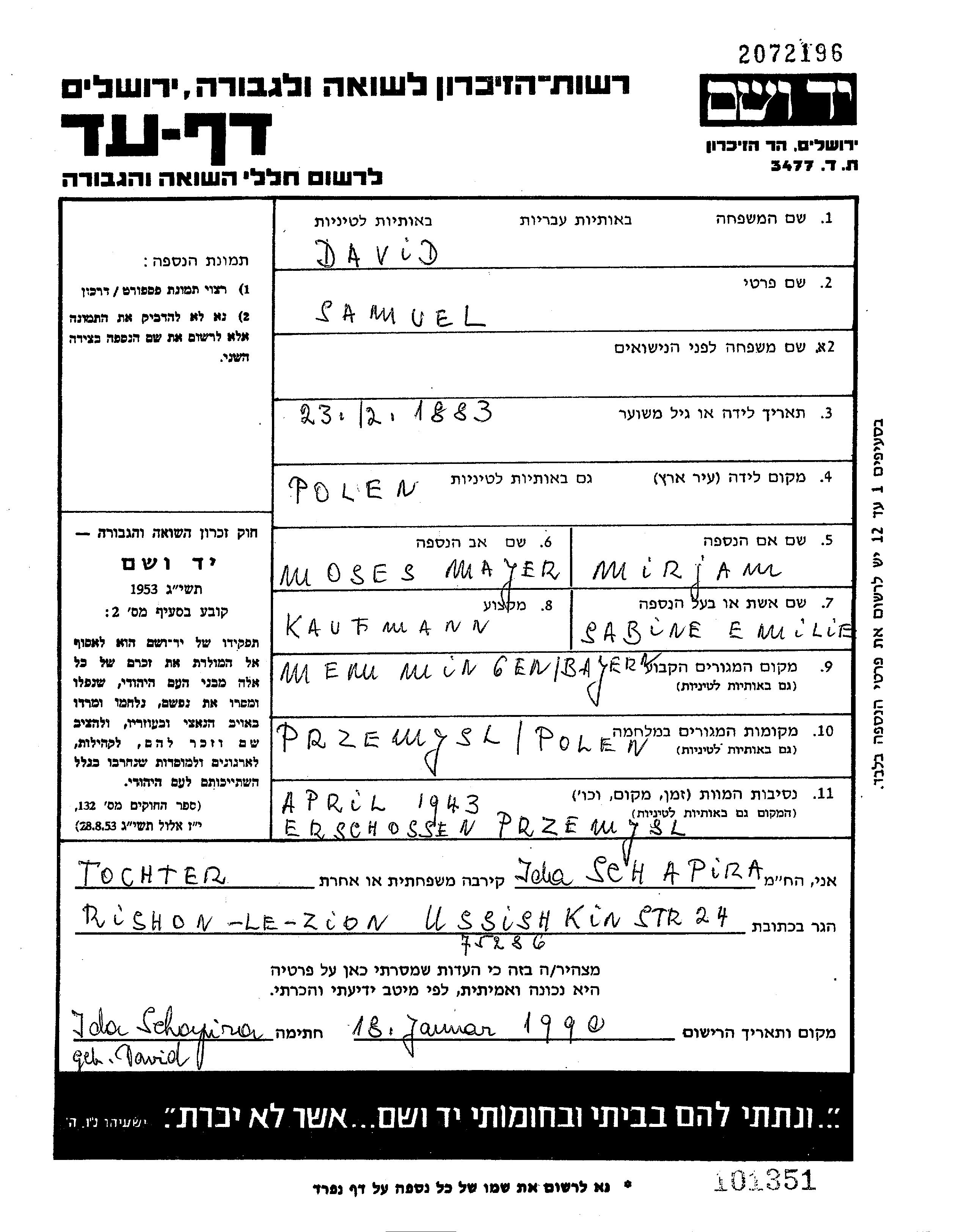 Шмуэль уничтожен в период Шоа. место смерти: Пшемысль, Польша в 1943.