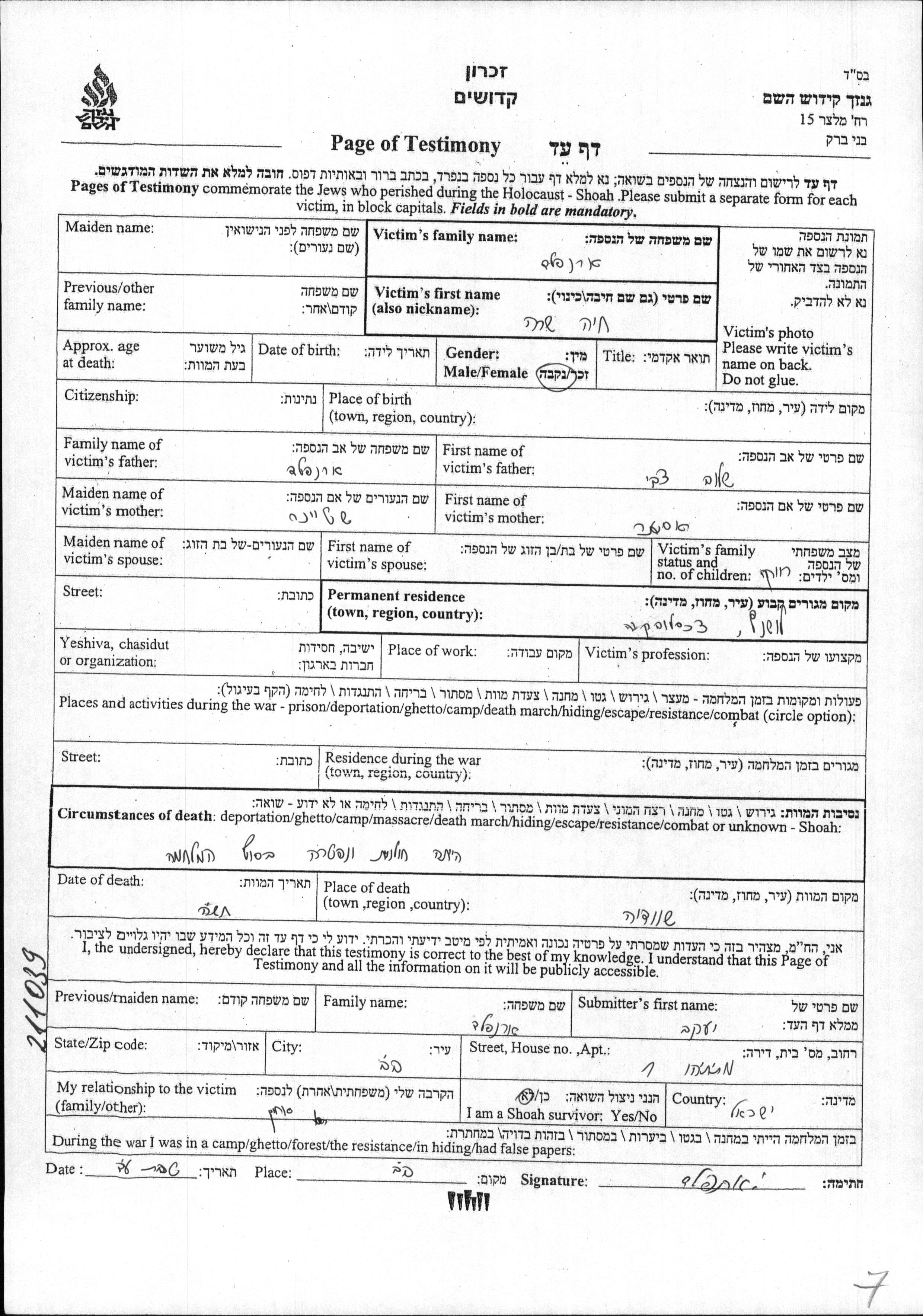 Яд Вашем - Листы свидетельских показаний Мемориального фонда
