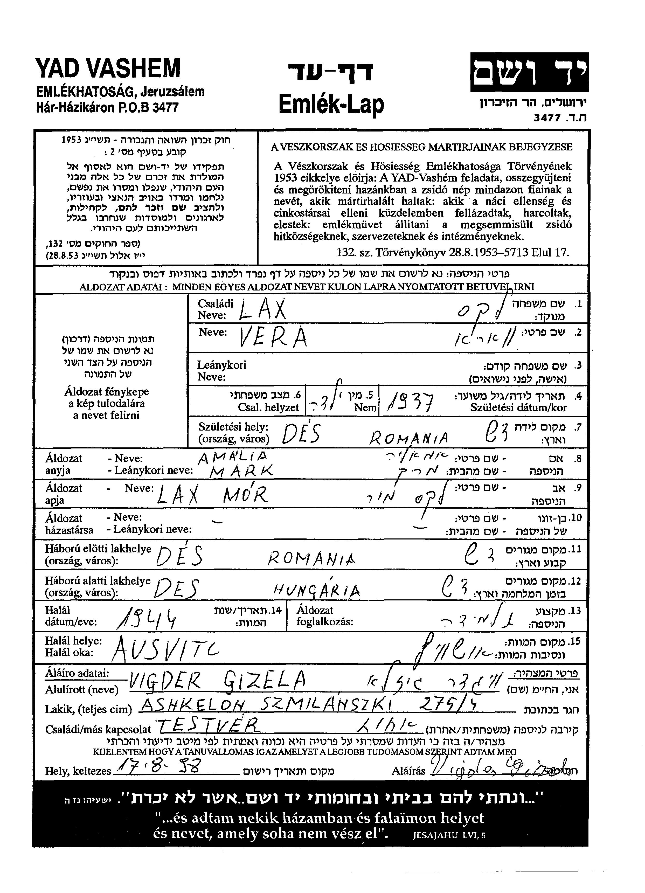 Вера Лакс, место рождения: Деж, Румыния. Отец: Мор, mать:Амалия, девичья фамилия Марк. Ученик / ученица. Ребенок. Место жительства до войны: Деж, Румыния. Место во время войны: Деж, Румыния.