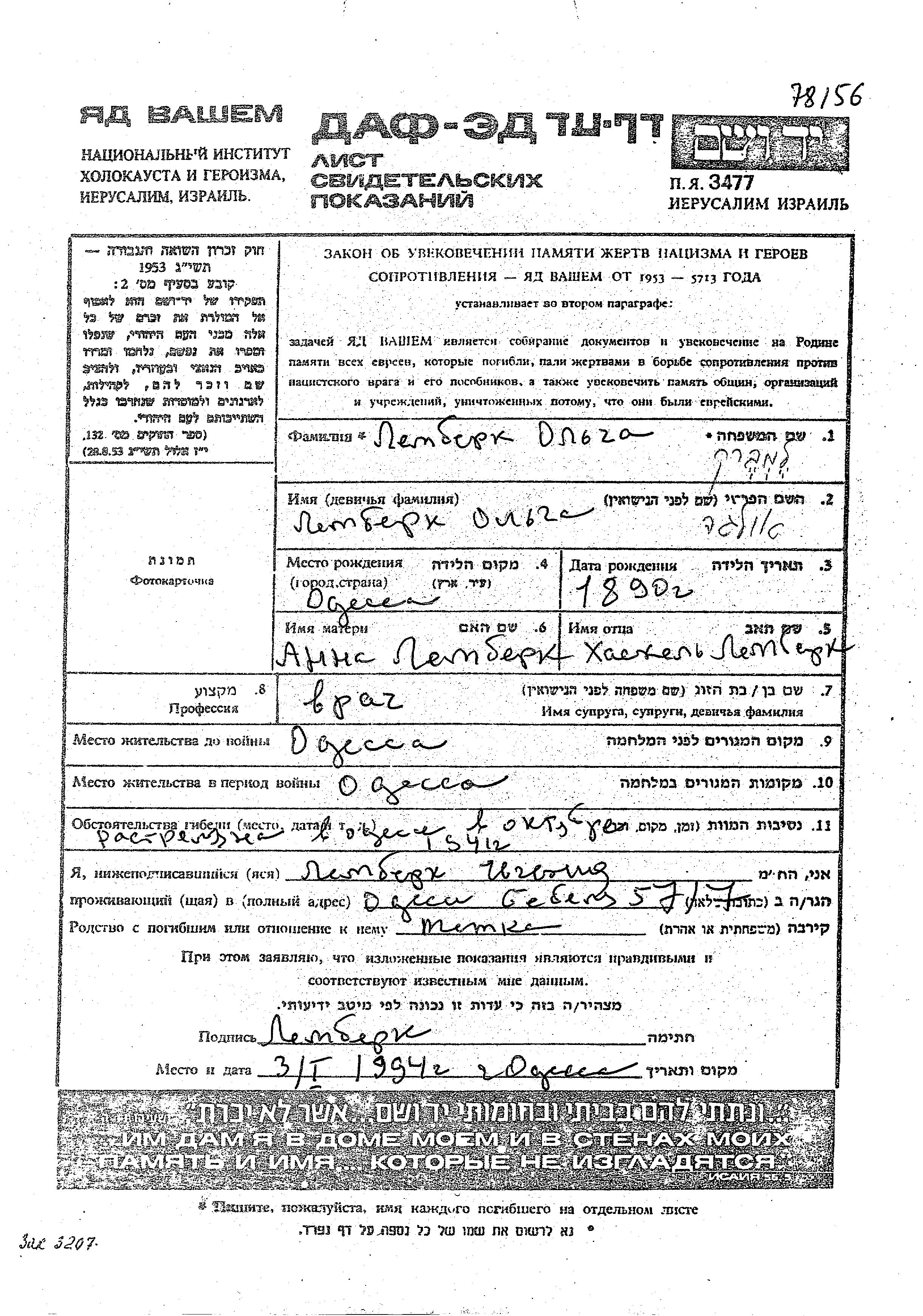 Лемберк | Ольга | 1890 | Одесса, Украина (СССР) | Лист свидетельских показаний |
