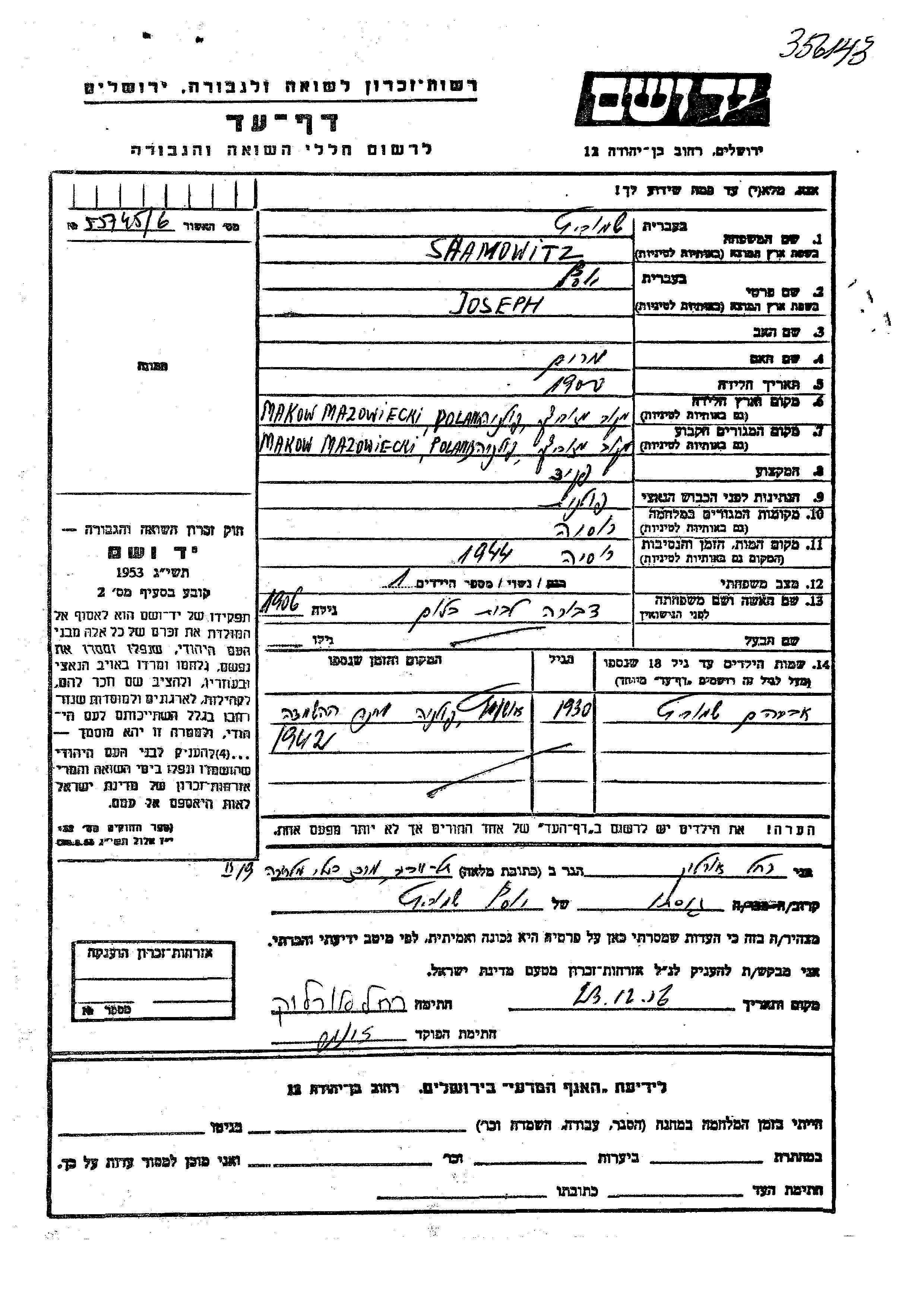 Йосеф Шамовиц, место рождения: Маков-Мазовецки, Польша.Mать:Мирьям. Клерк. Женат / замужем. Место жительства до войны: Маков-Мазовецки, Польша. Место во время войны: Россия (СССР).