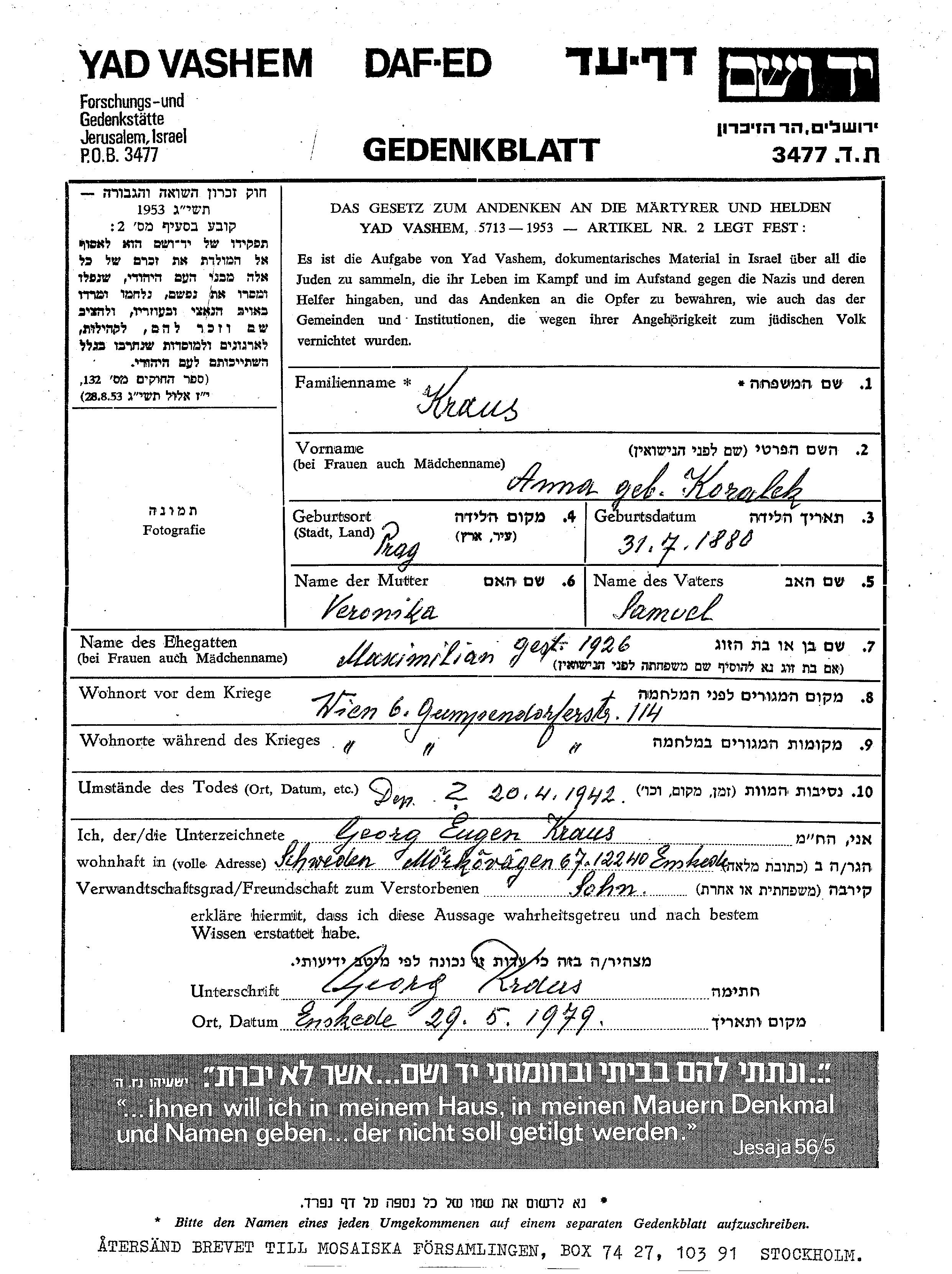 Анна Краус, девичья фамилия Коралек, место рождения: Прага, Чехословакия. Место жительства до войны: Вена, Австрия.