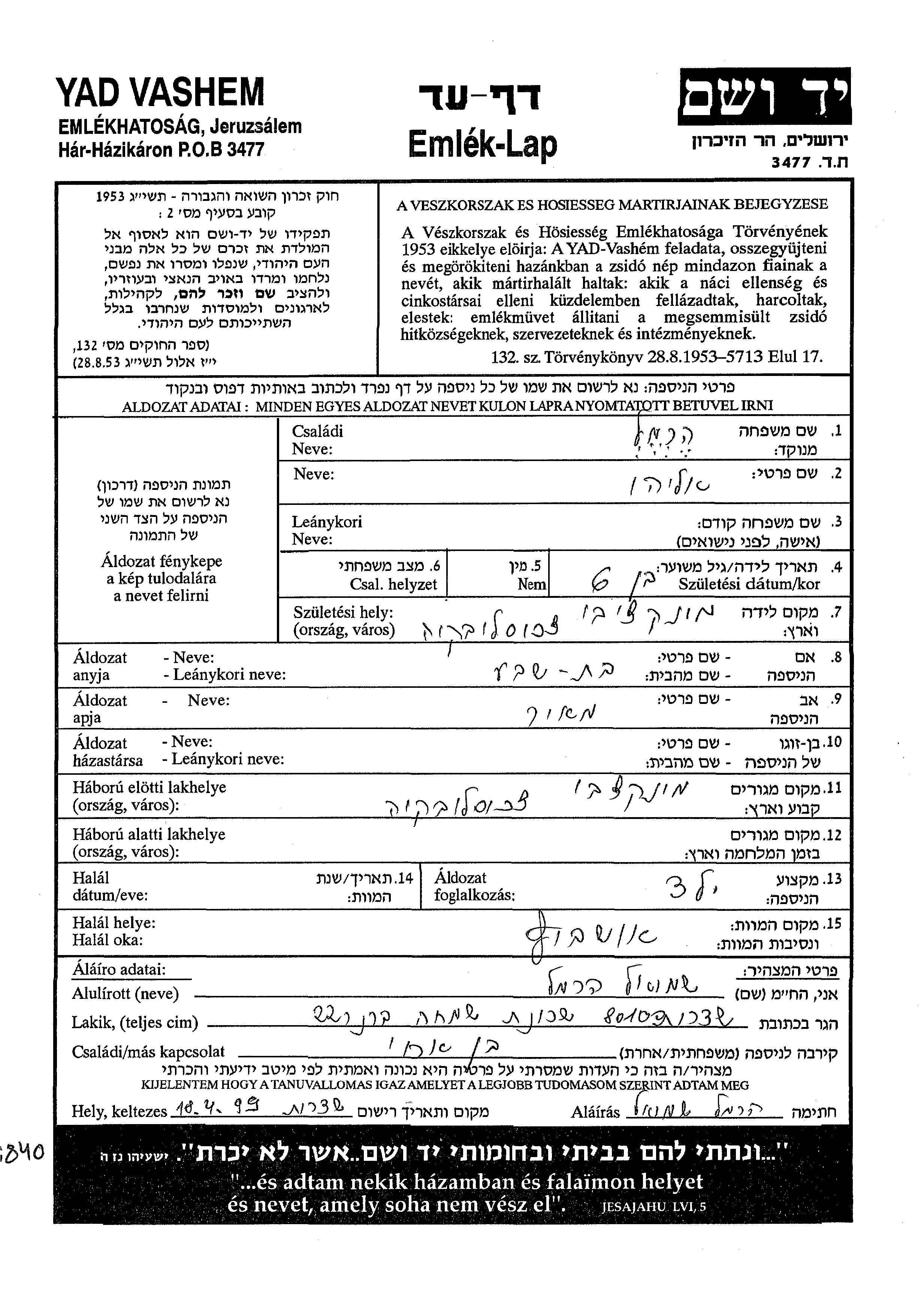 | Хермель | Элиягу | Мункач, Чехословакия | Лист свидетельских показаний | |
