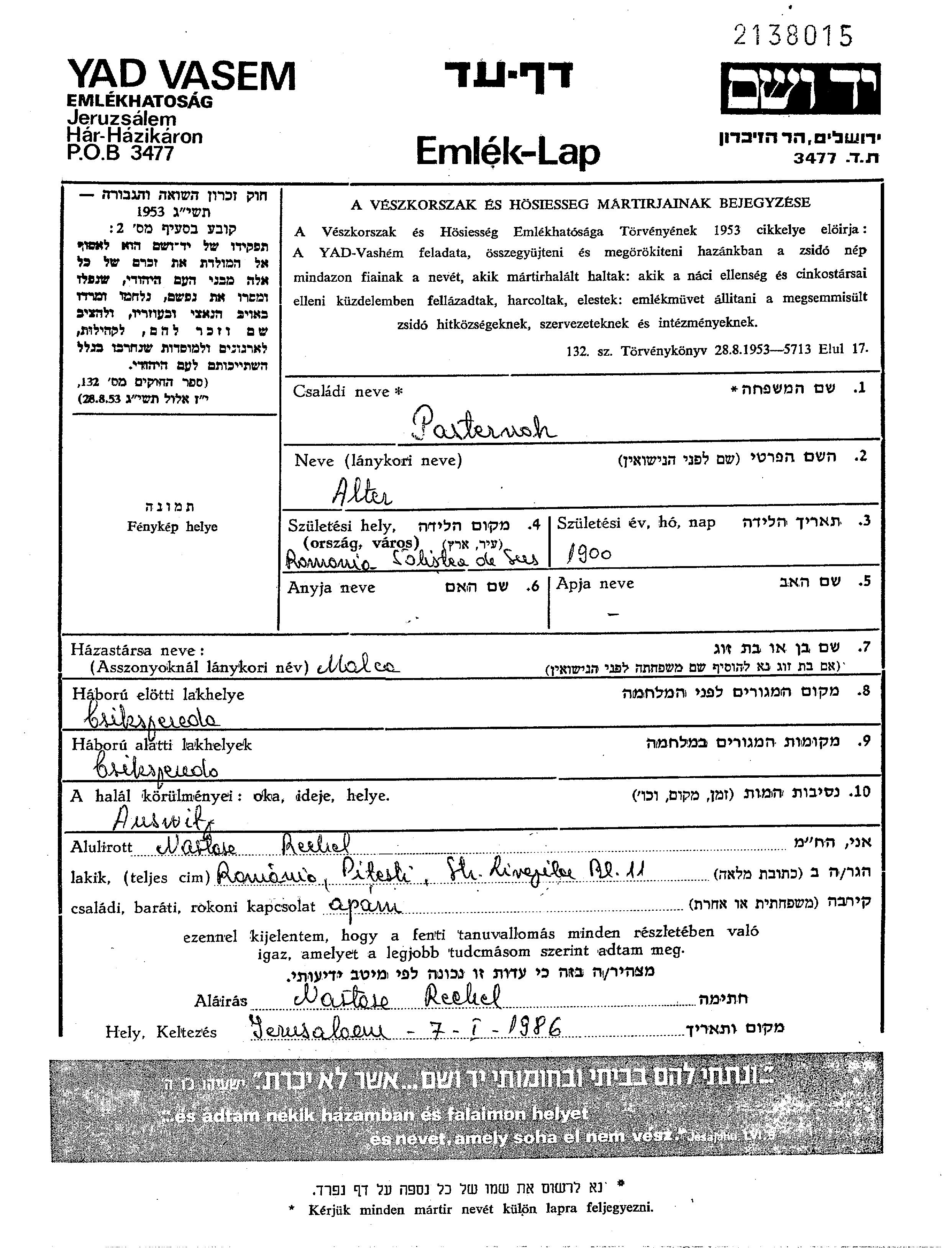 Пастернак | Алтер | Чиксереда, Румыния | Лист свидетельских показаний | |