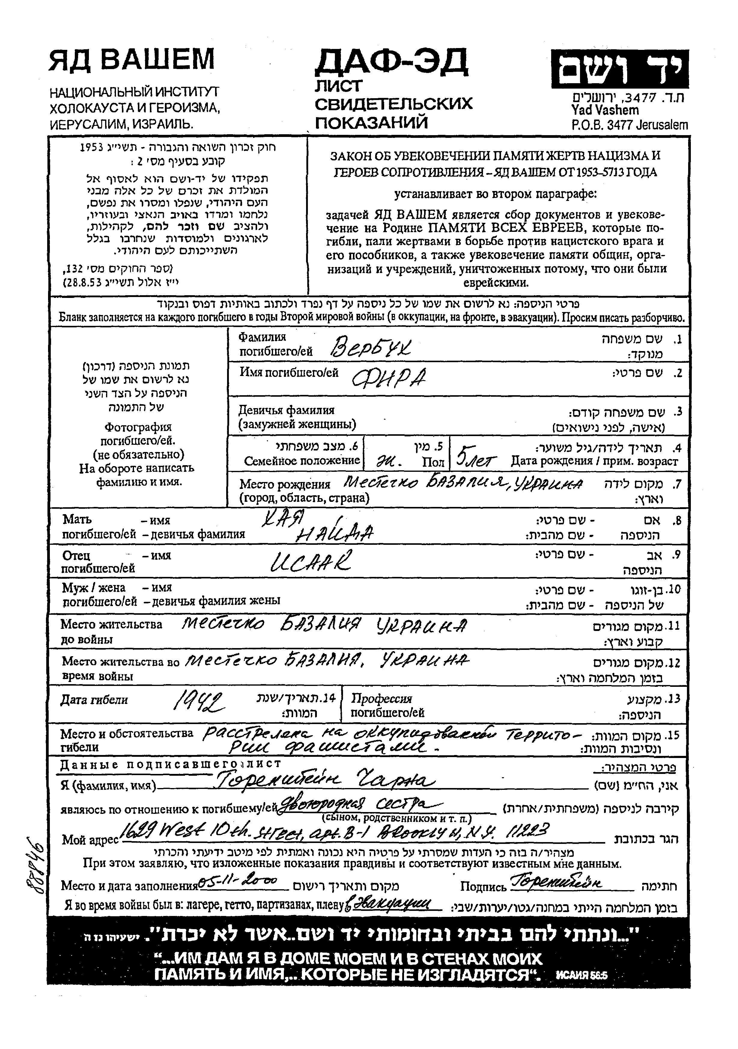 Вербух Фира Базалия, Украина (СССР) Лист свидетельских показаний