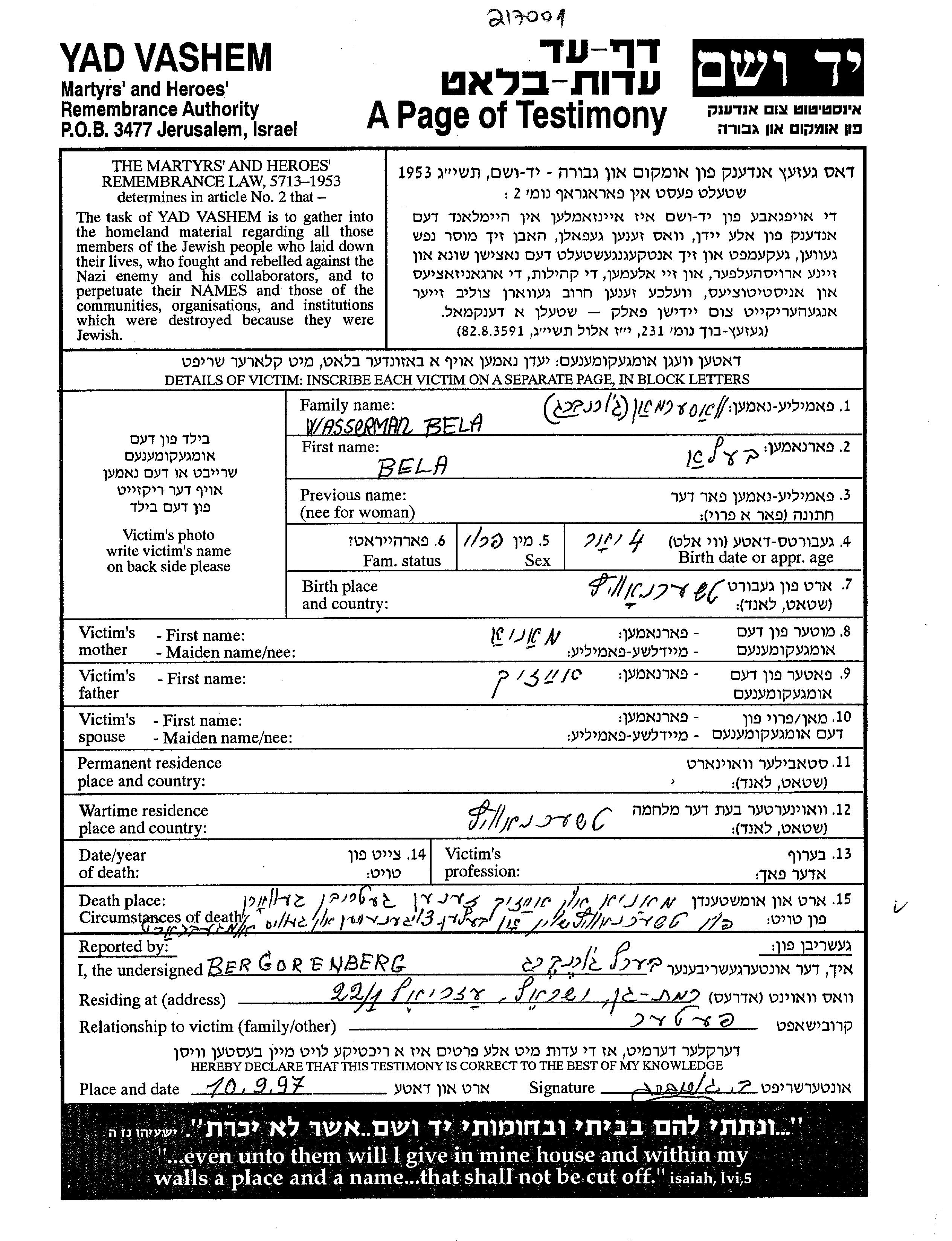 Вассерман | Бела | Черновцы, Румыния | Лист свидетельских показаний | |