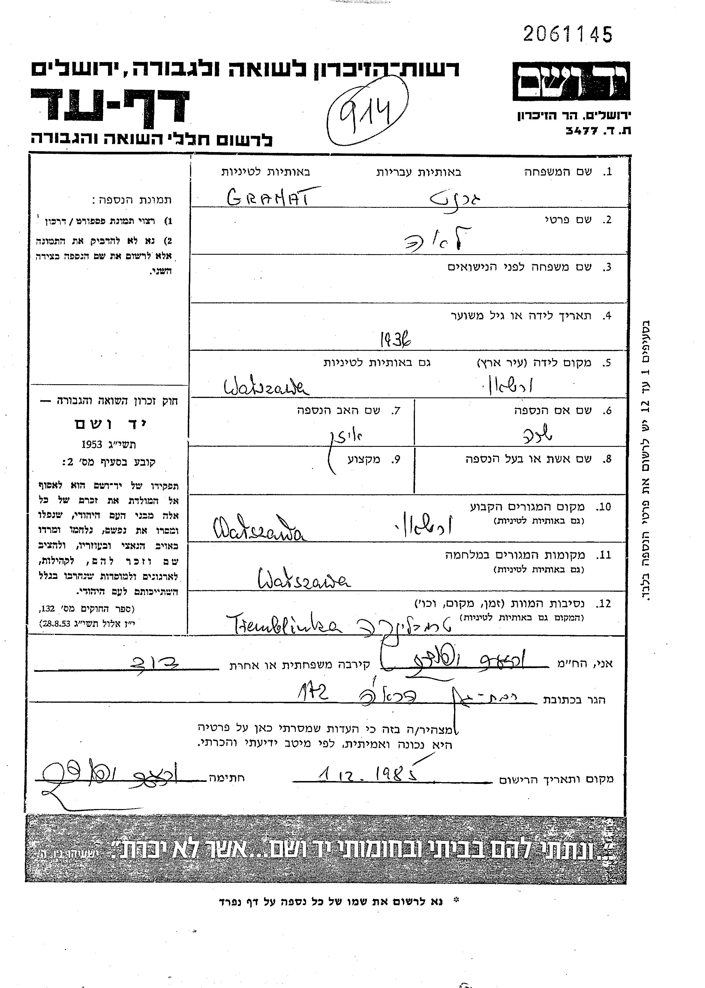 Гранат Грант Лея Варшава, Польша Лист свидетельских показаний