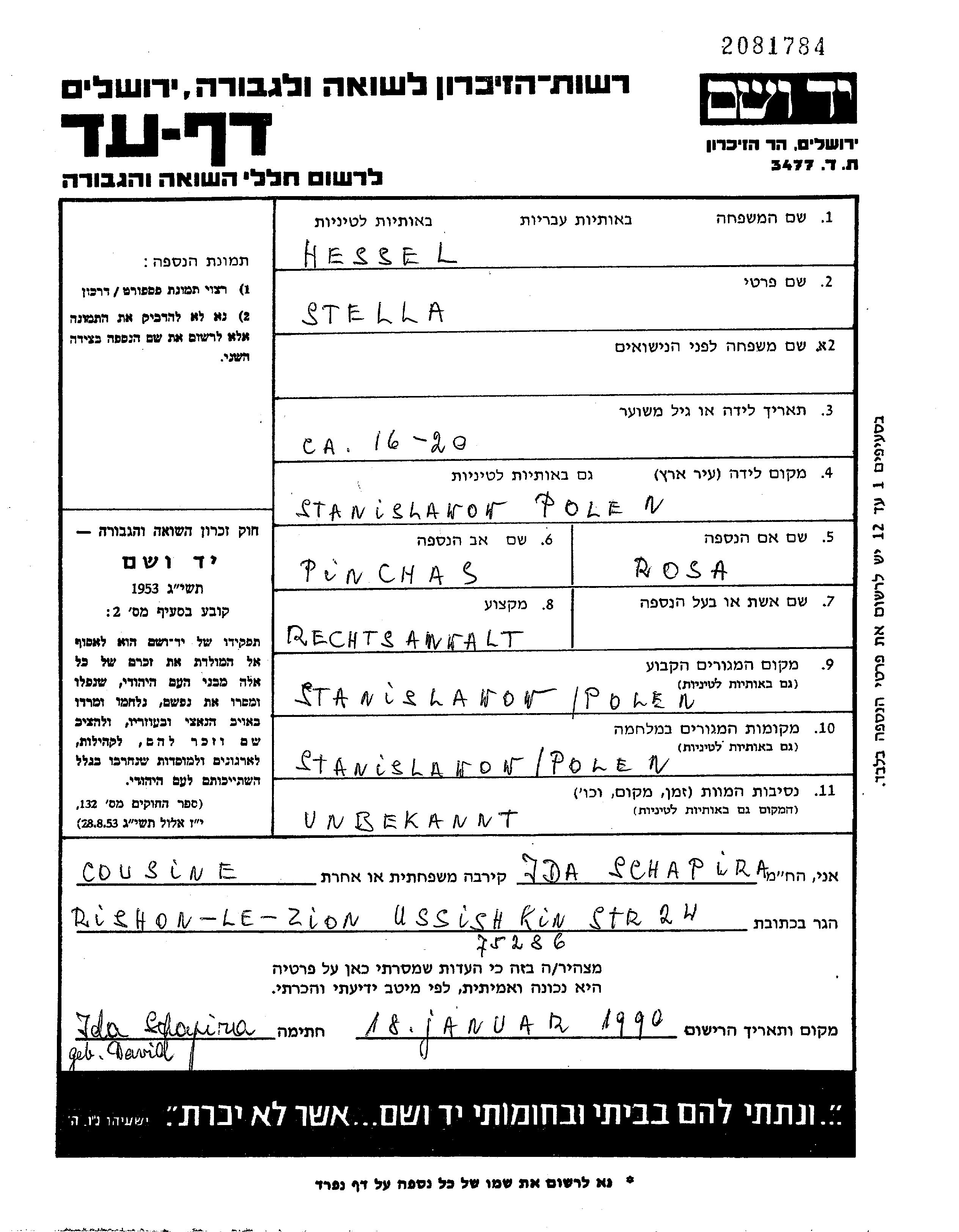 | Хессель | Стелла | Станиславув, Польша | Лист свидетельских показаний | |