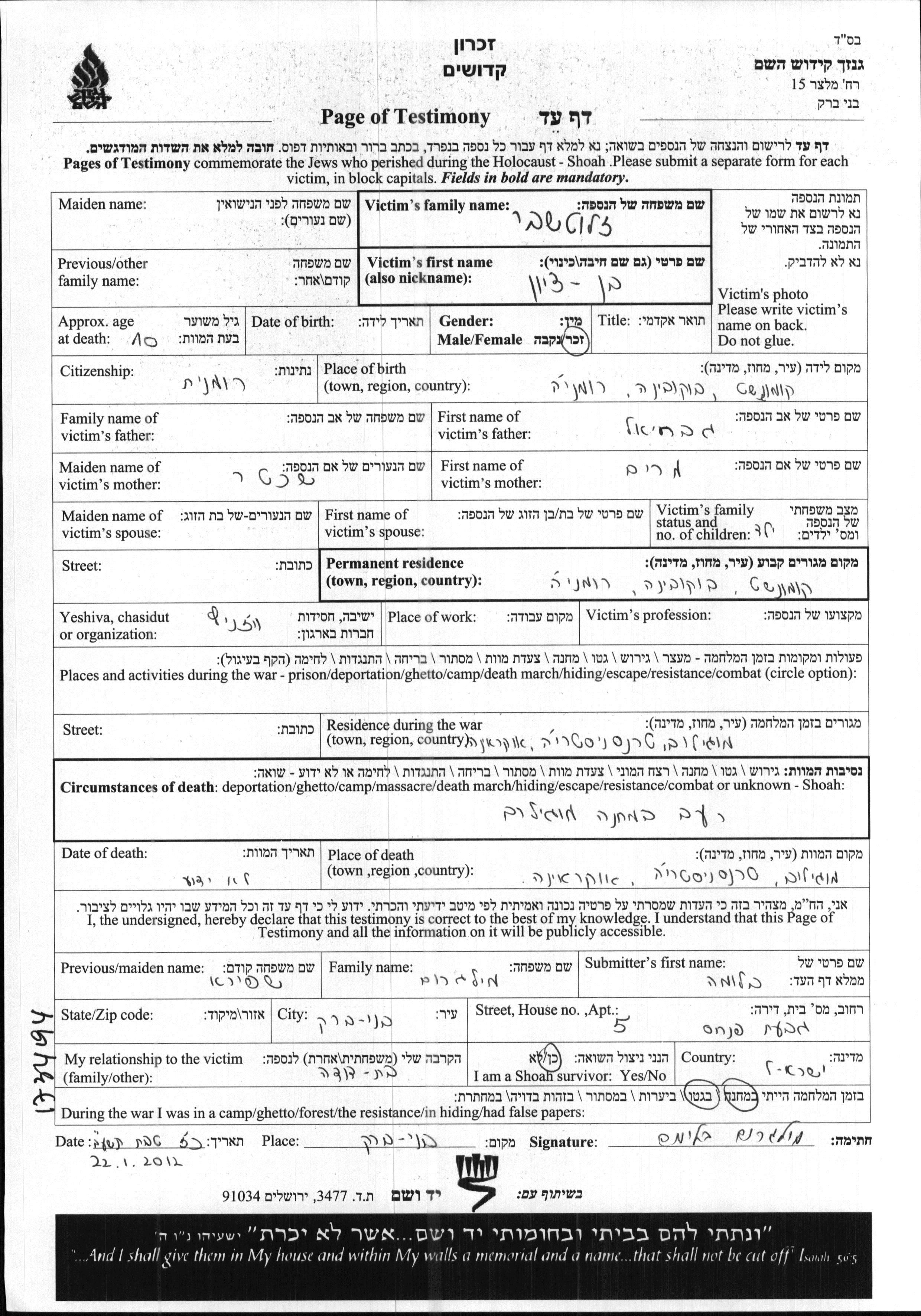 Злочовер Бенцион Команешт, Румыния Лист свидетельских показаний