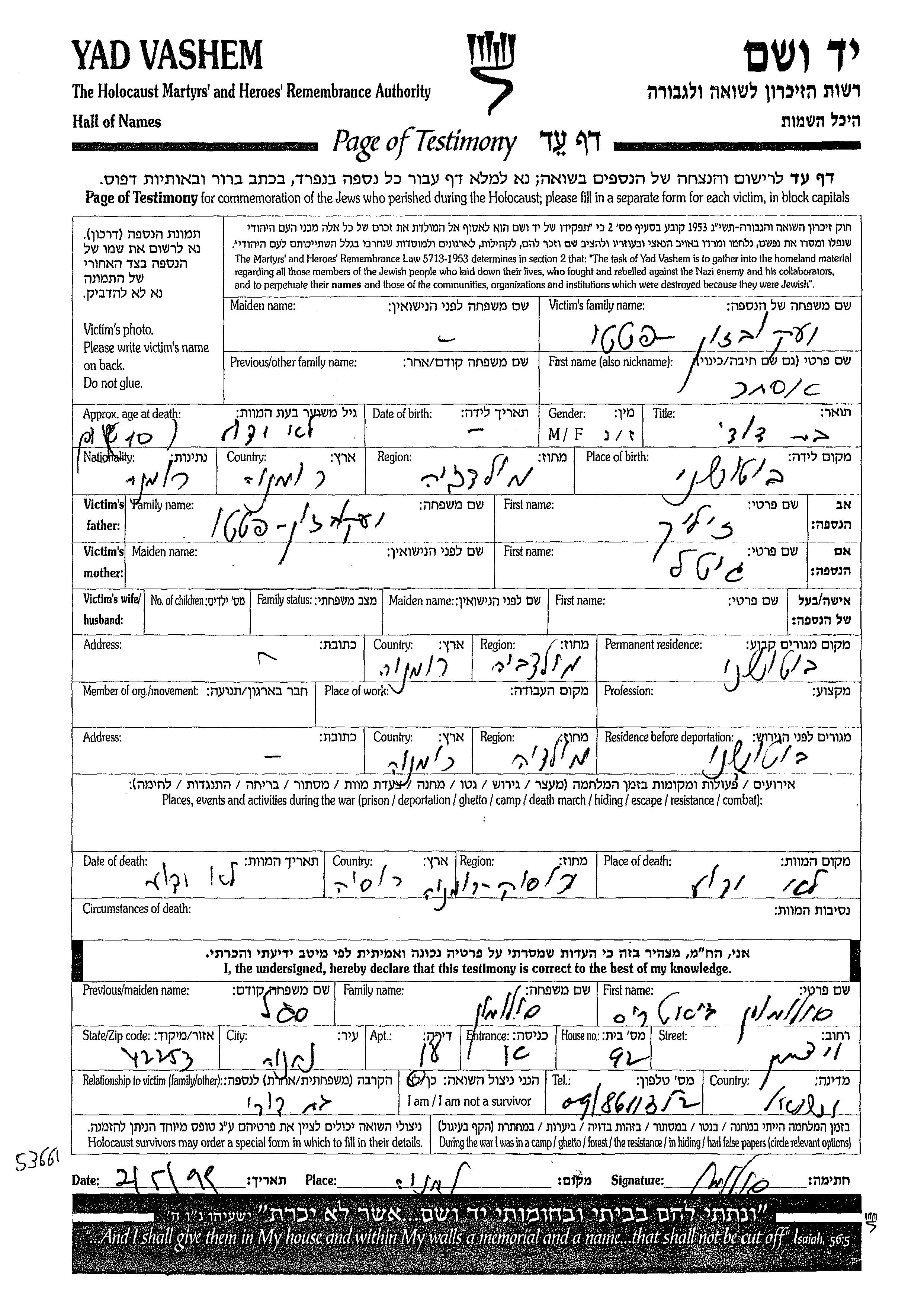 Якобсон Патато Эстер Ботошань, Румыния Лист свидетельских показаний