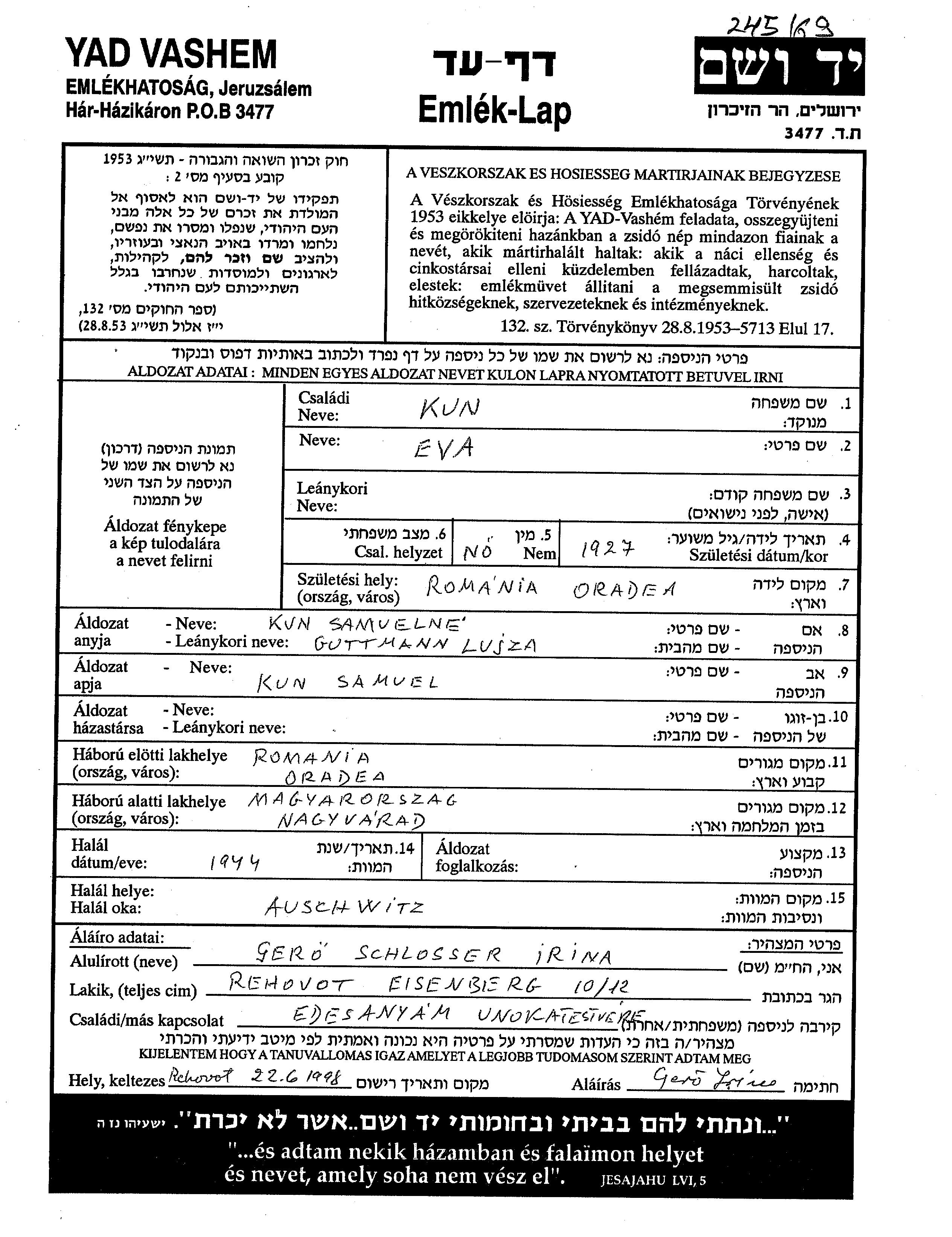 Эва Кун, место рождения: Орадя, Румыния. Отец: Шмуэль, mать:Луиза, девичья фамилия Гуттманн. Женат / замужем. Место жительства до войны: Орадя, Румыния. Место во время войны: Надьварад, Румыния.