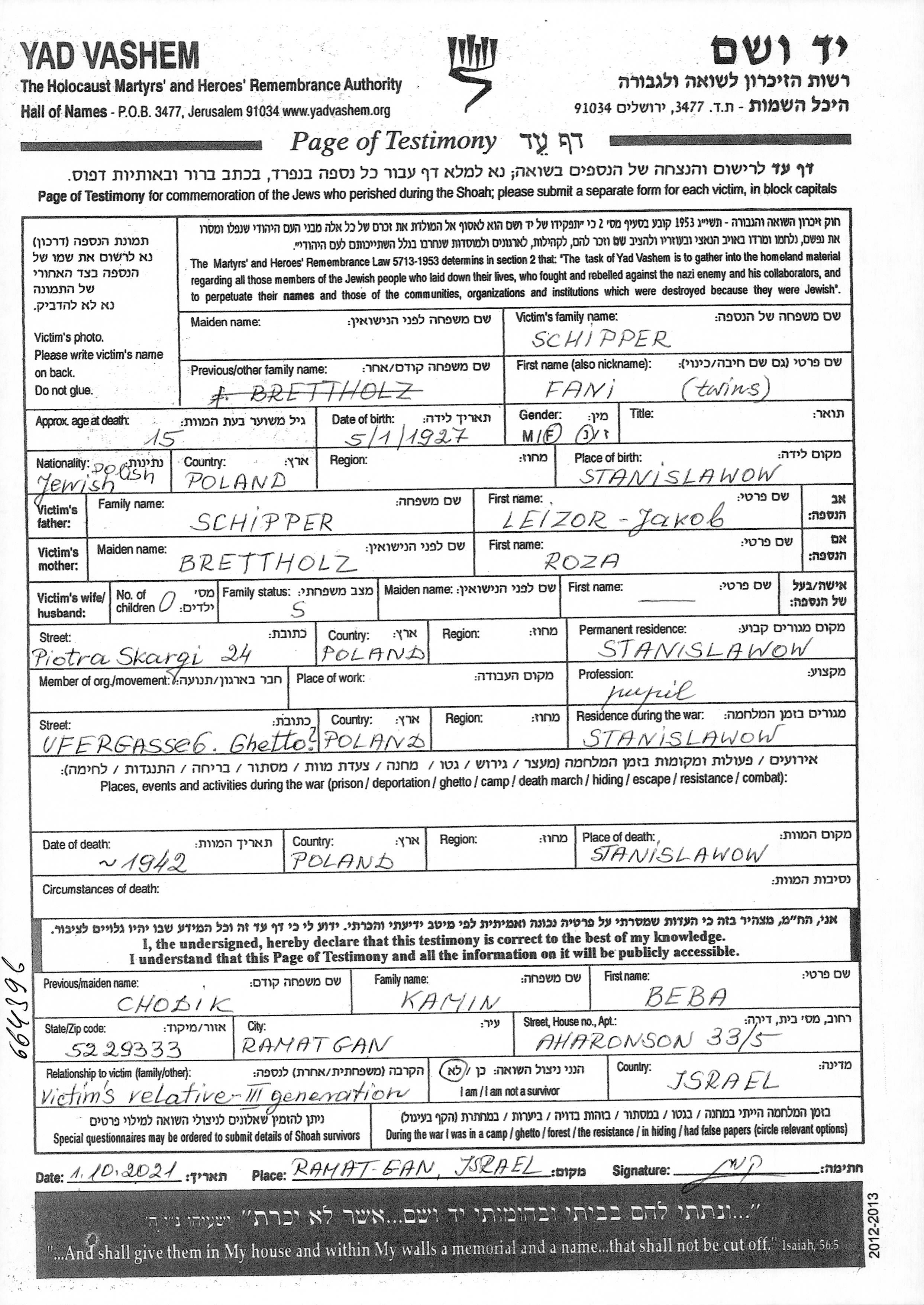 Фани Шиппер, место рождения: Станиславув, Польша. Отец: Лейзор Якоб, mать:Роза, девичья фамилия Бреттхольц. Ученик / ученица. Подросток. Место жительства до войны: Станиславув, Польша. Место во время войны: Станиславув, Польша.