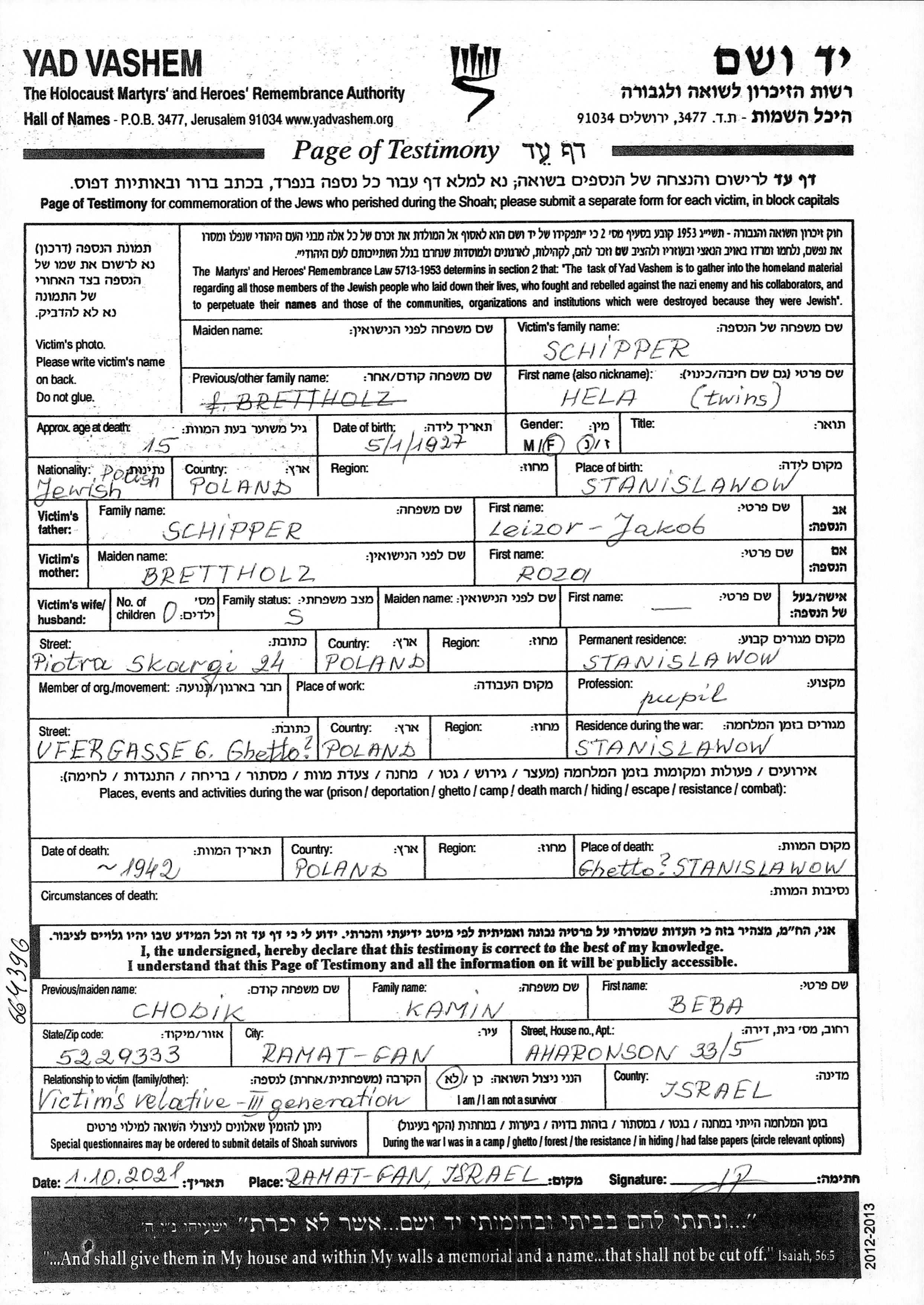Хела Шиппер. Отец: Лейзор Якоб, mать:Роза, девичья фамилия Бреттхольц. Ученик / ученица. Подросток. Место жительства до войны: Станиславув, Польша. Место во время войны: Станиславув, Польша.
