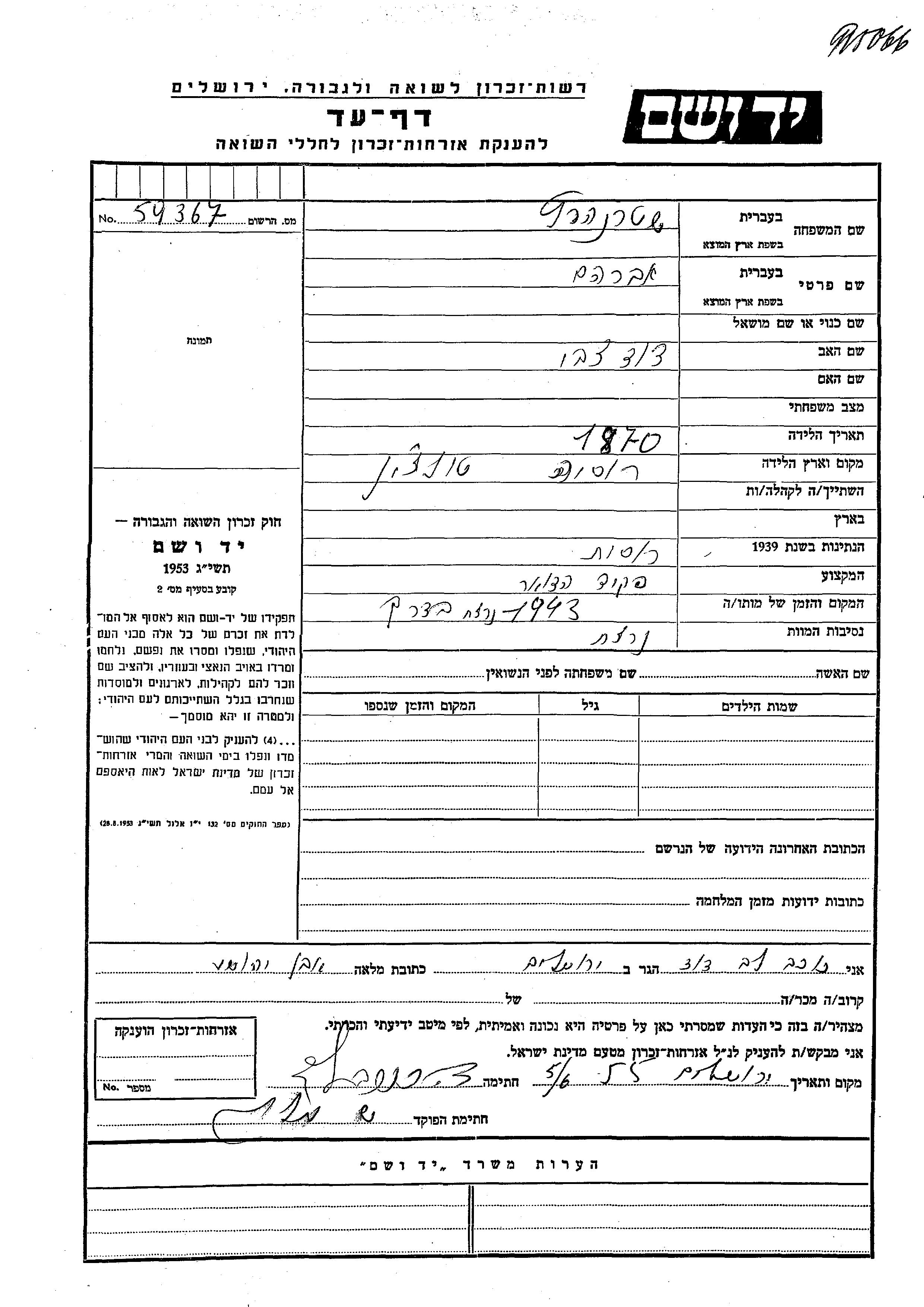 Яд Вашем - Листы свидетельских показаний Мемориального фонда