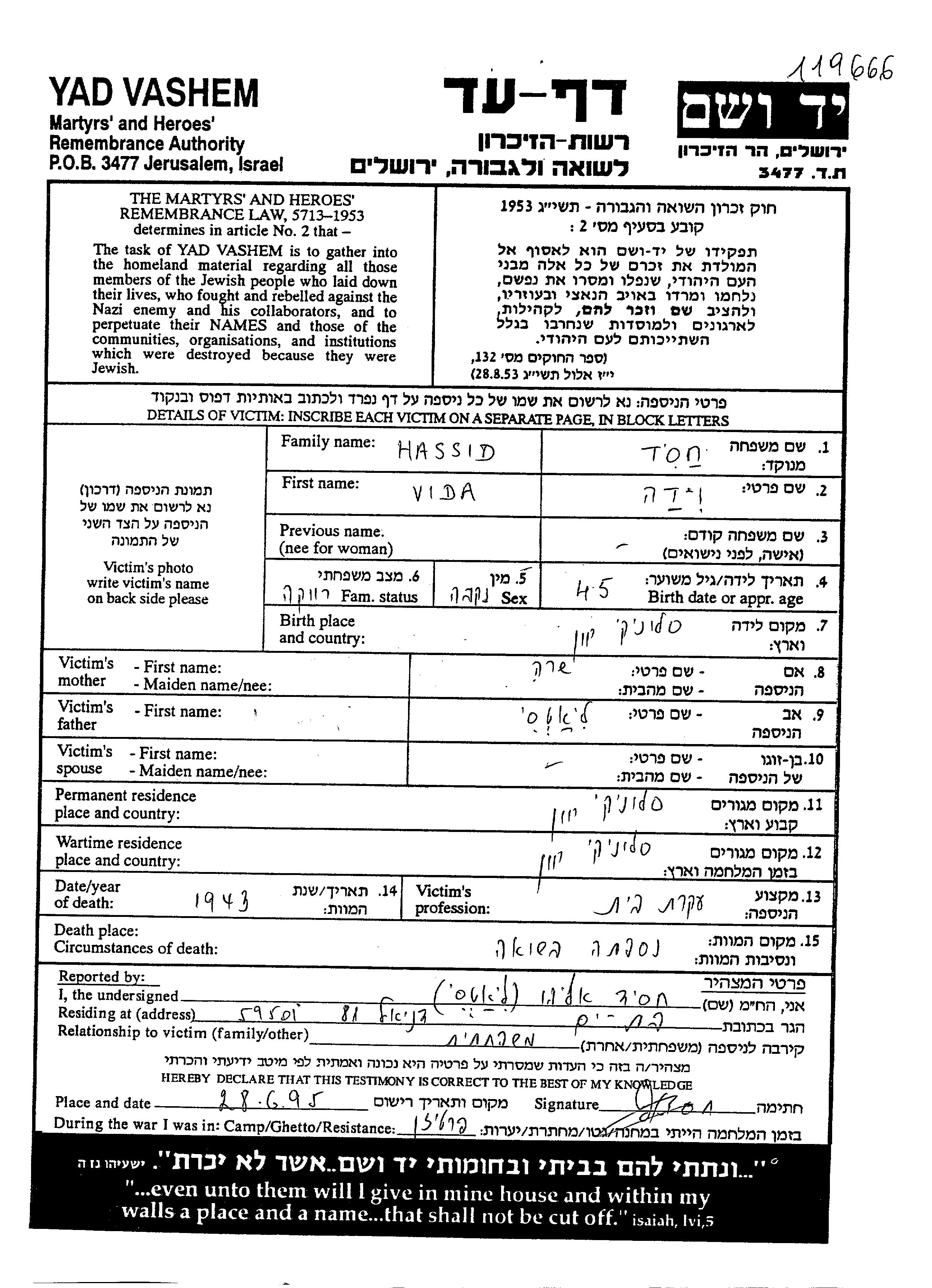 Вида Хассид, место рождения: Салоники, Греция. Домохозяйка. Место жительства до войны: Салоники, Греция.