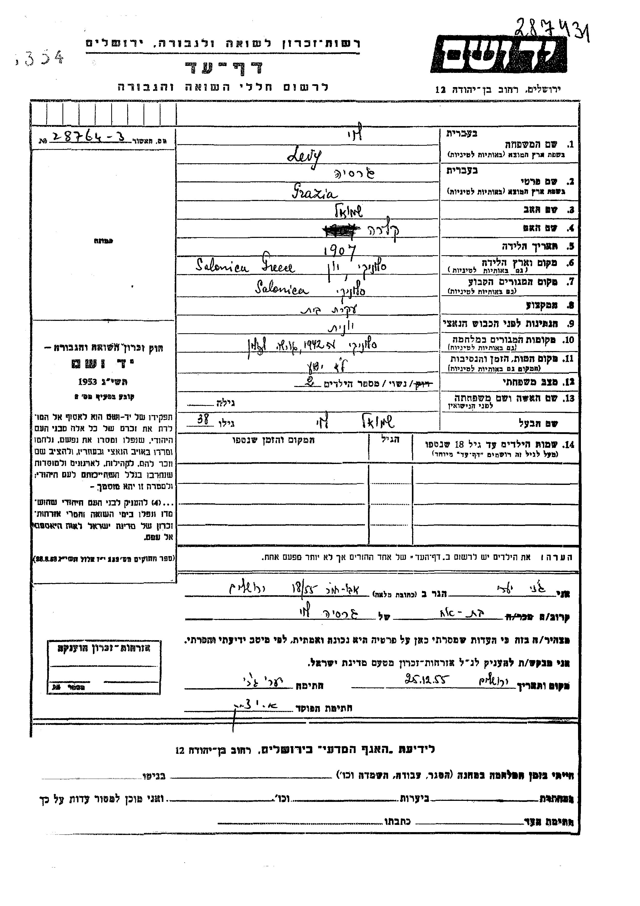 Леви Грация 1907 Салоники, Греция Лист свидетельских показаний