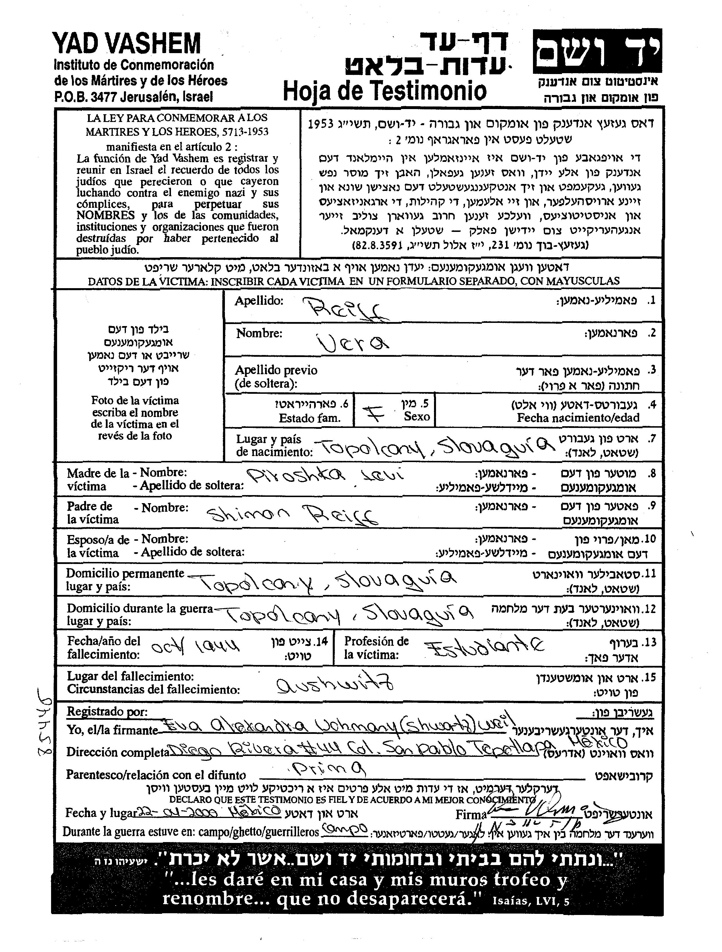 Рейфф | Вера | Топольчани, Чехословакия | Лист свидетельских показаний | |
