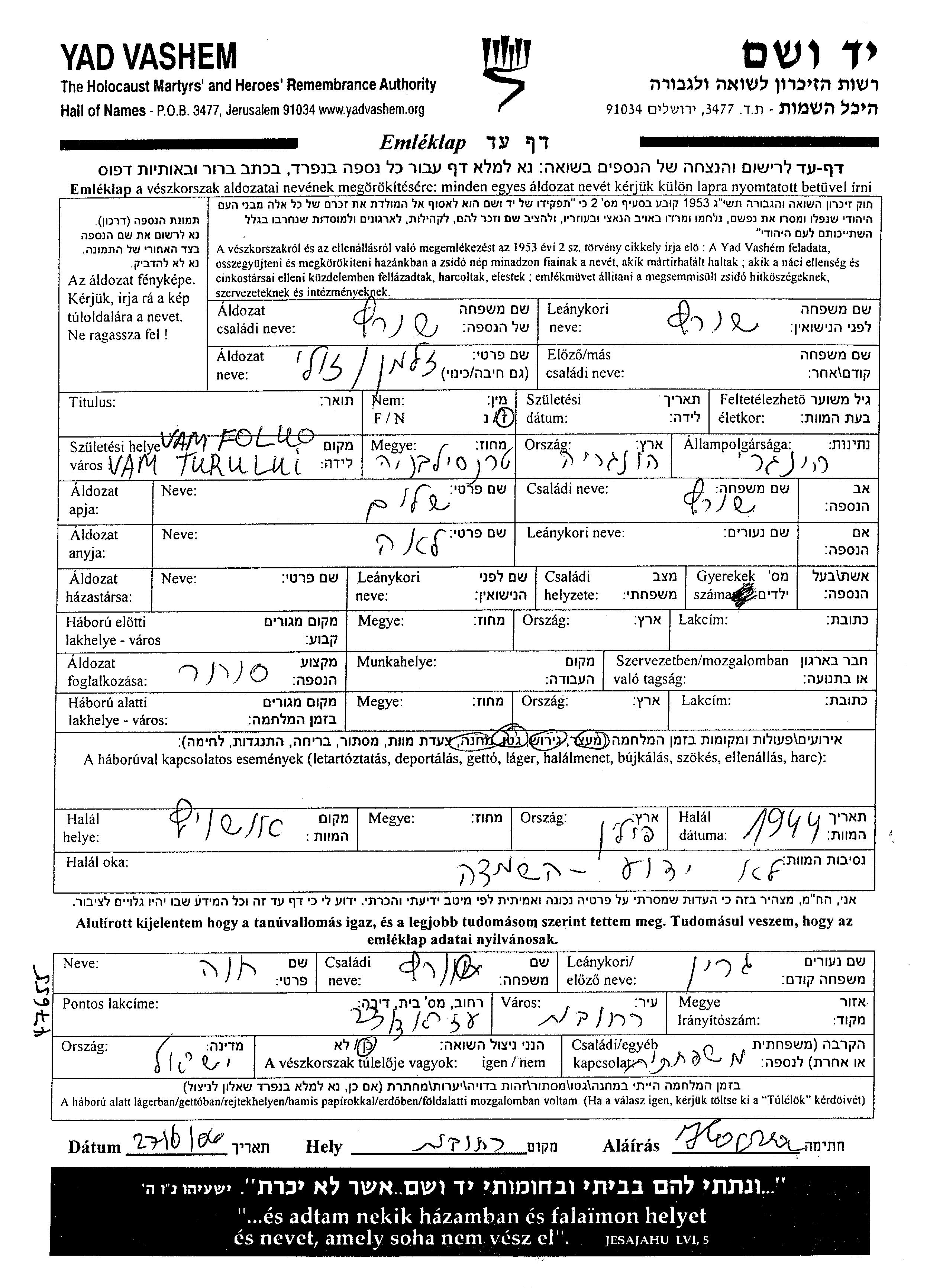 Шварц Золи Залман Вама Турулуй, Румыния Лист свидетельских показаний