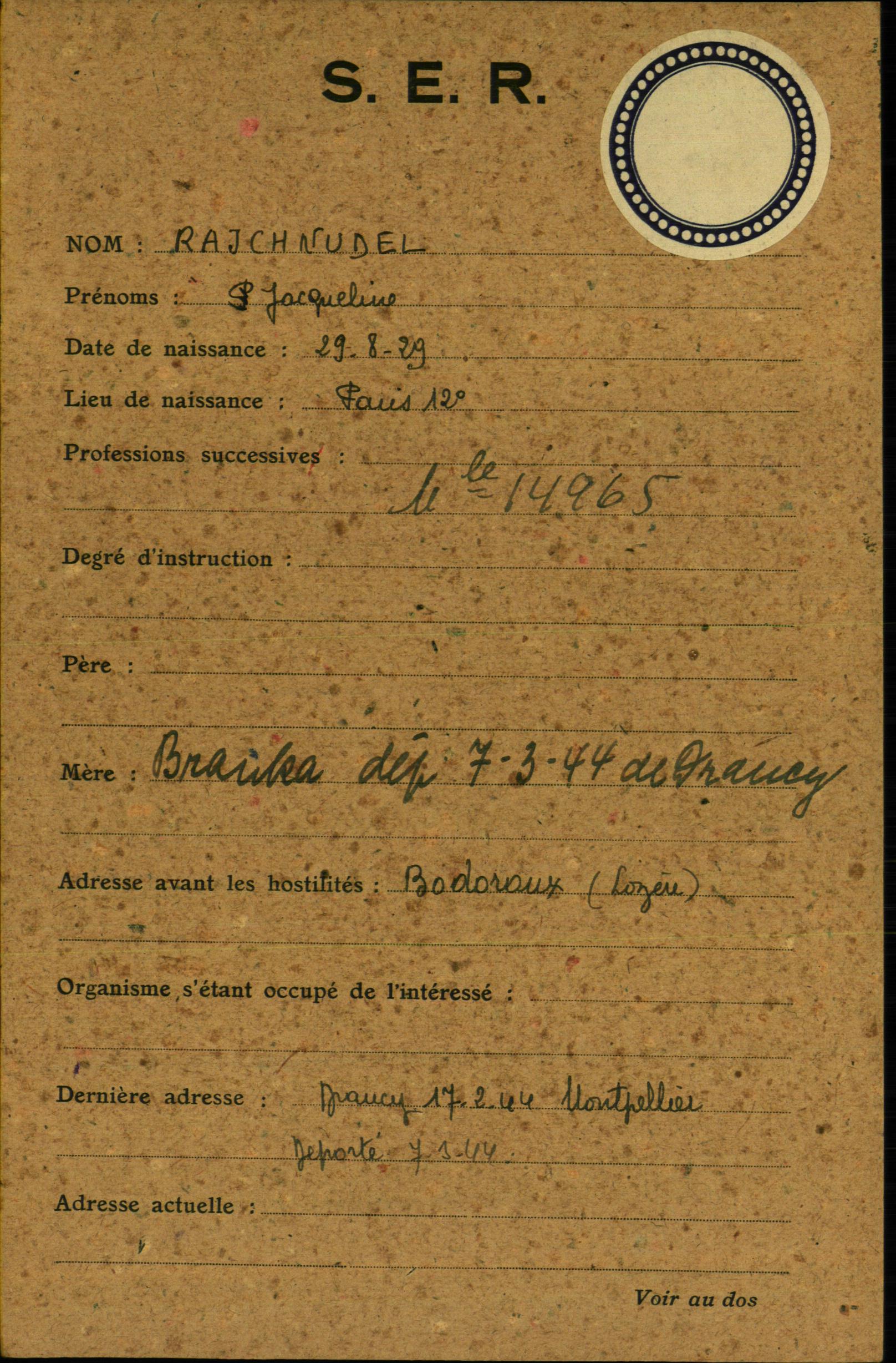 Жаклин Райхнудель, место рождения: Париж, Франция. Место жительства до войны: Бадару, Франция.