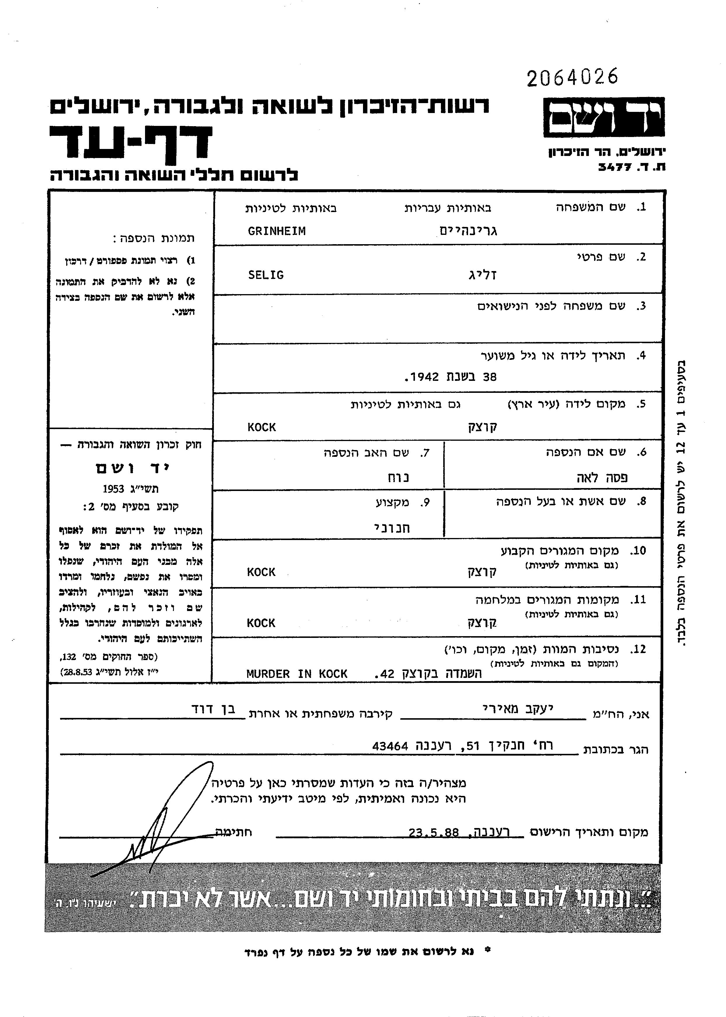 Гринхайм Зелиг Коцк, Польша Лист свидетельских показаний