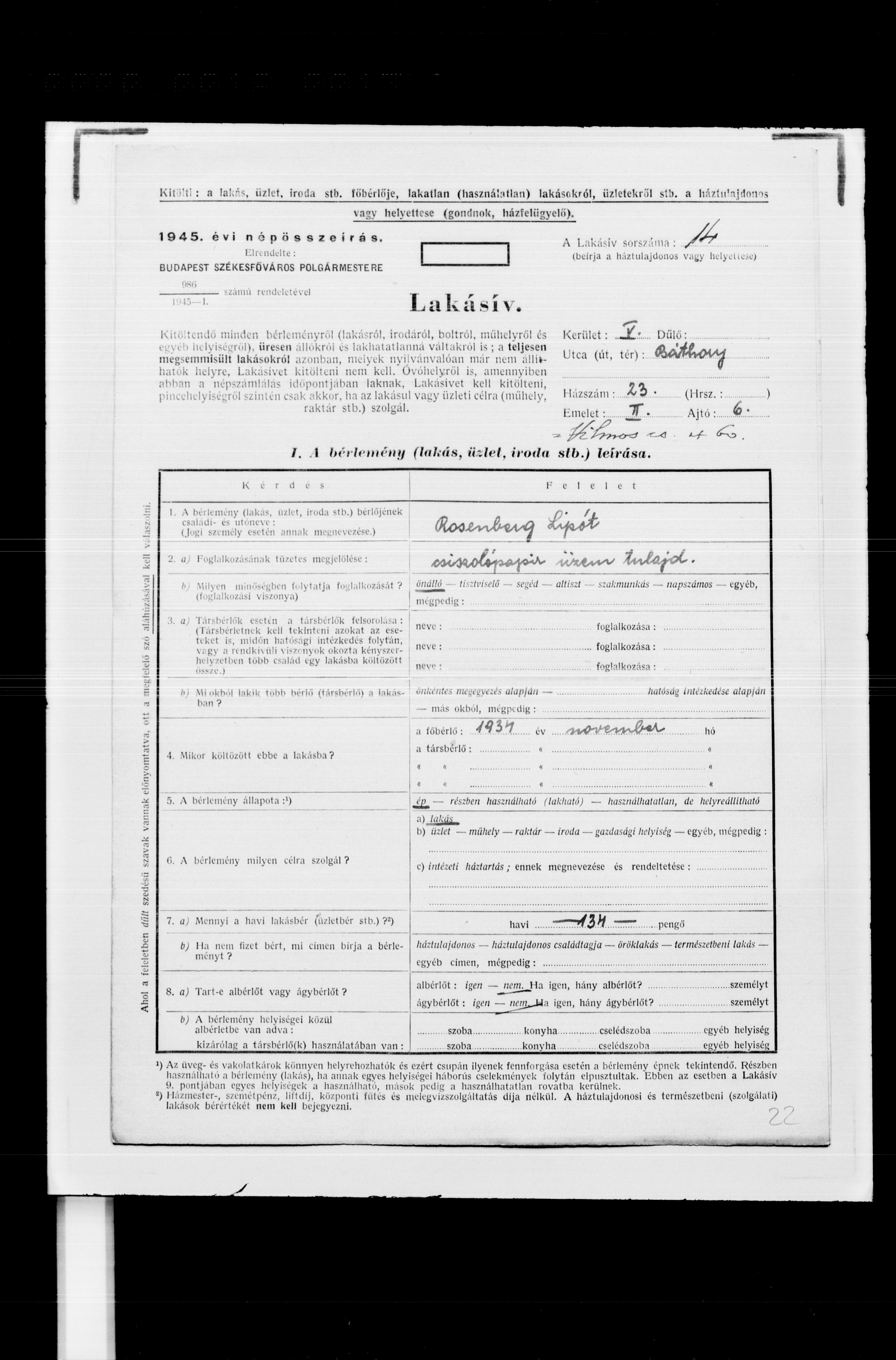 Questionnaire filled out by Rosenberg Lipót, residing at Báthory u. 23/6, Quarter V, in the context of the Population Census in Budapest, 1945