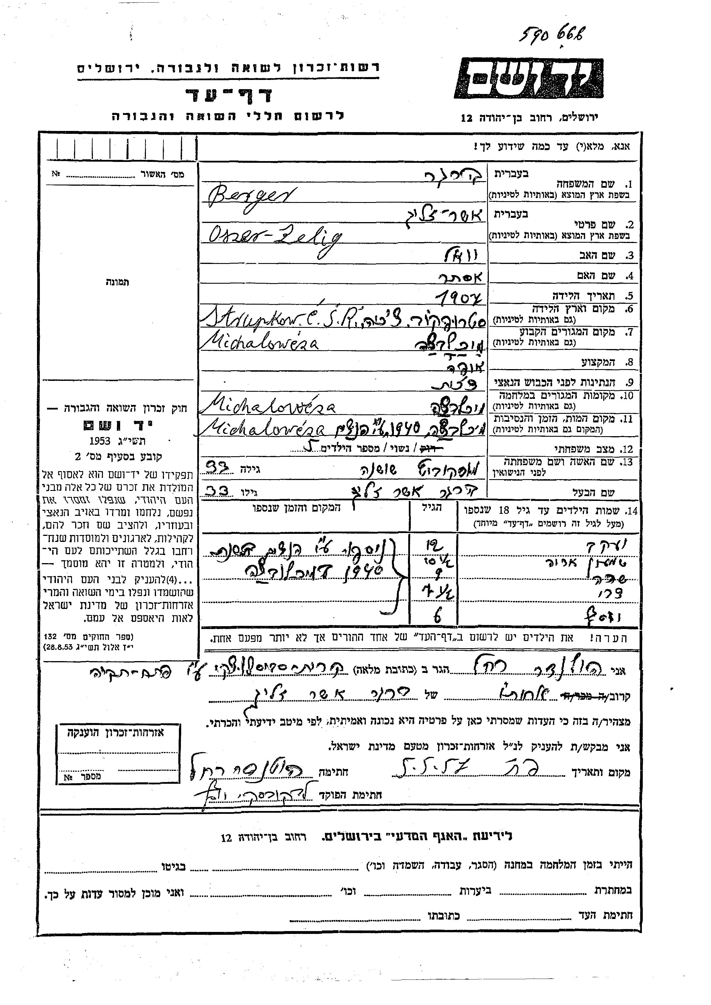 Бергер Яков Михаловце, Чехословакия Лист свидетельских показаний