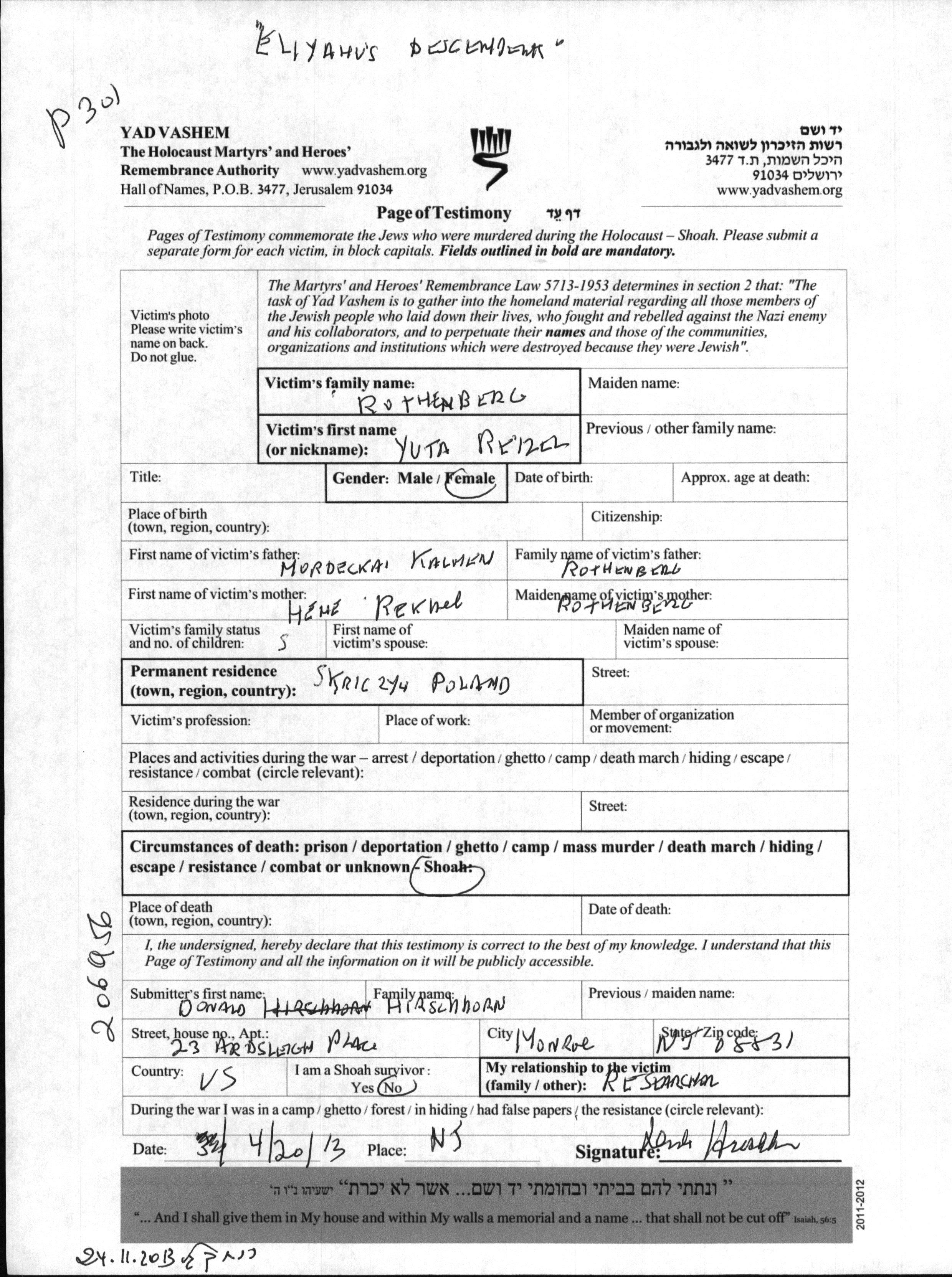 Ротенберг | Юта Рейзель | Скрыцин, Польша | Лист свидетельских показаний | |
