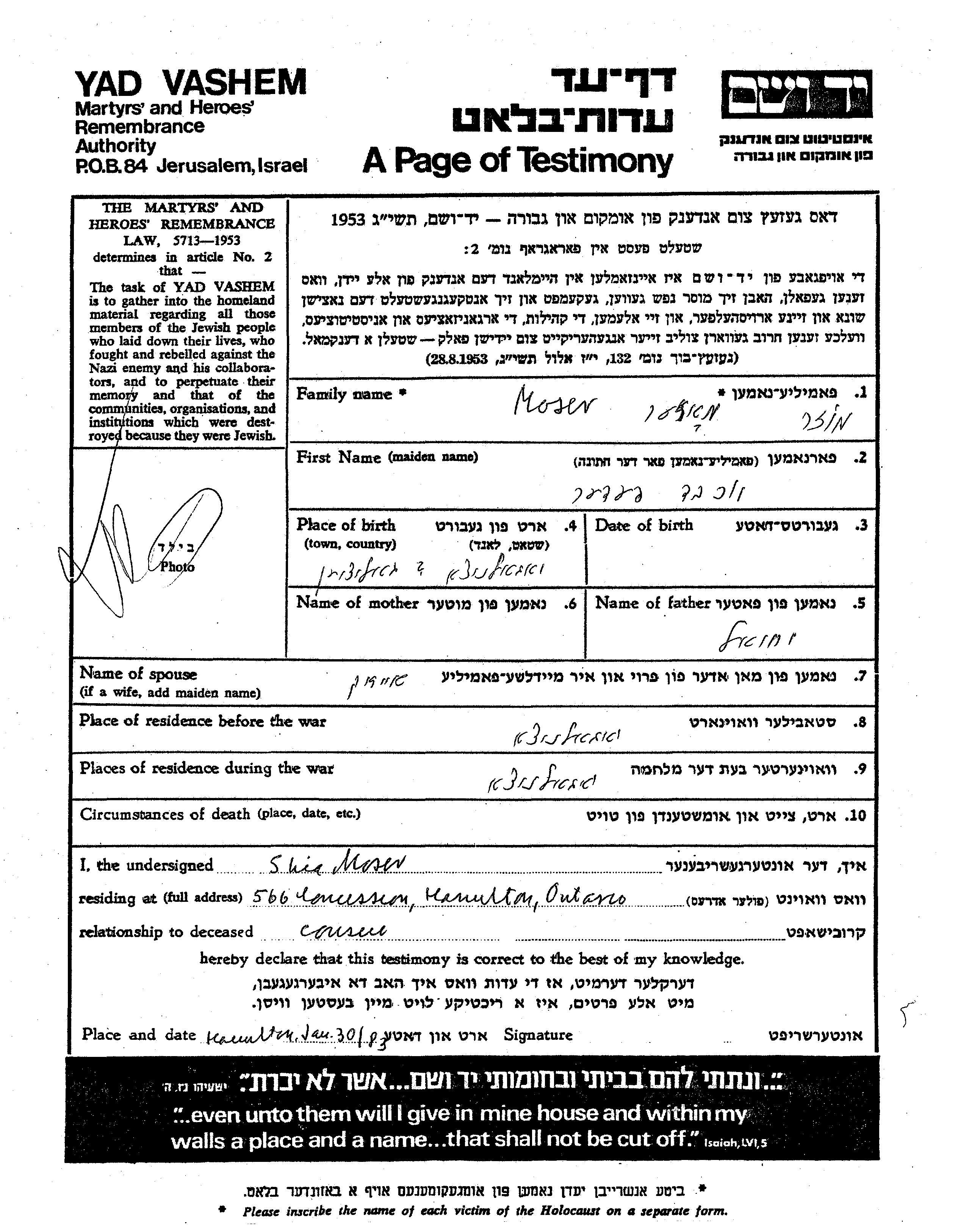 Мозер Йохевет 1901 Ягельница, Польша Лист свидетельских показаний