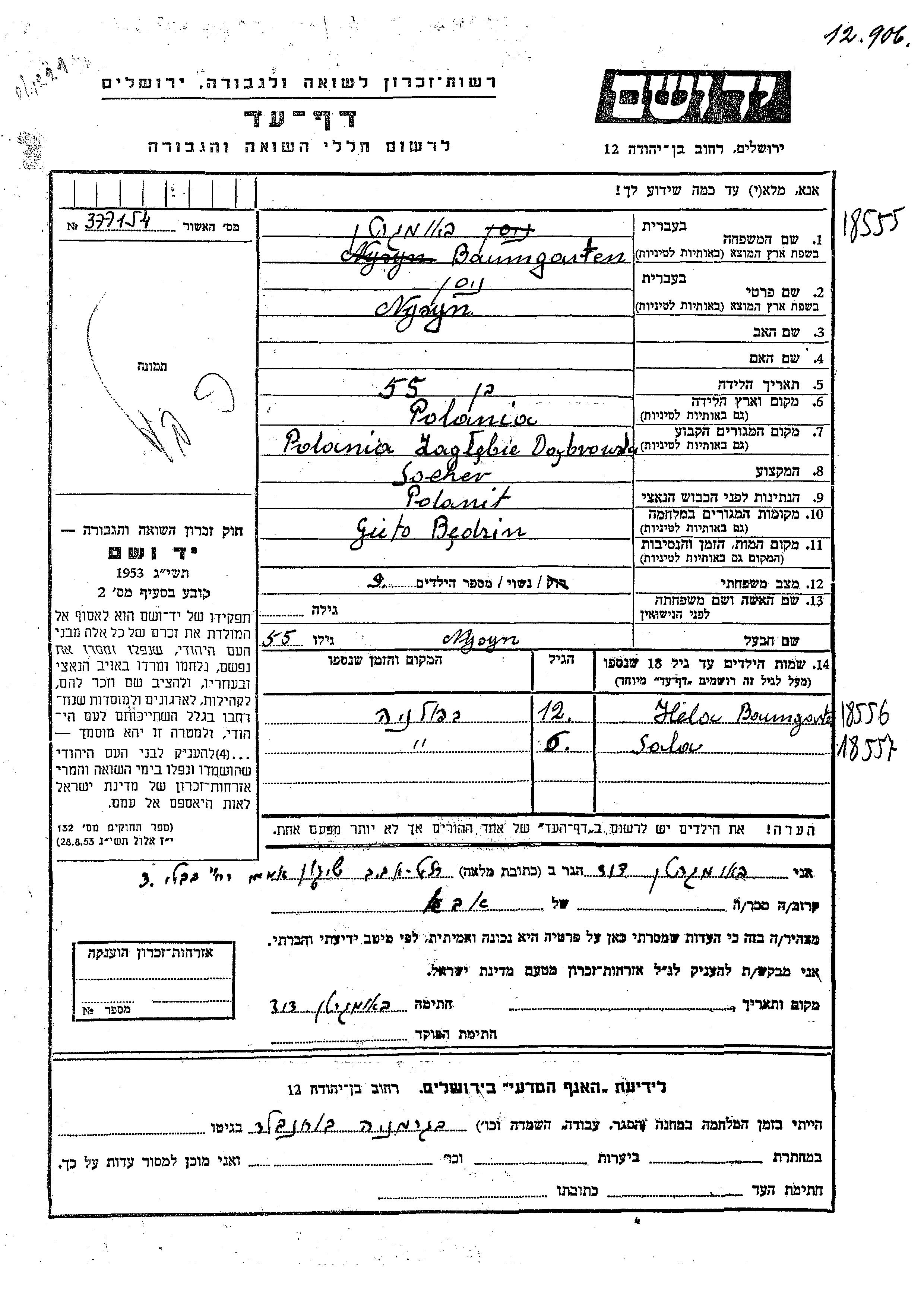 Нисин Баумгартен, место рождения: Польша. Торговец / торговка. Женат / замужем. Место жительства до войны: Zaglebie Region, Польша. Место во время войны: Бендзин, Польша.