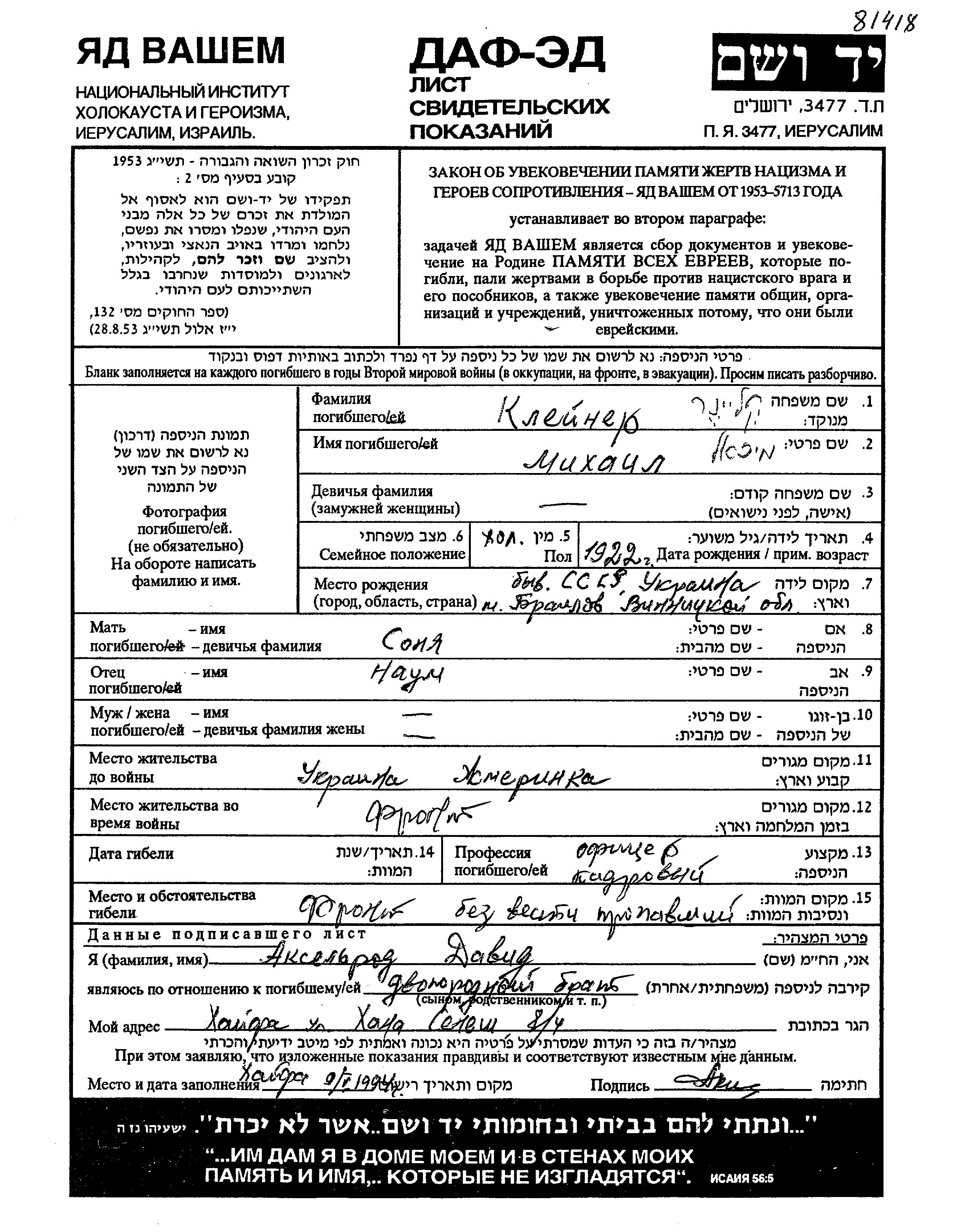 Клейнер Михаил 1922 Жмеринка, Украина (СССР) Лист свидетельских показаний