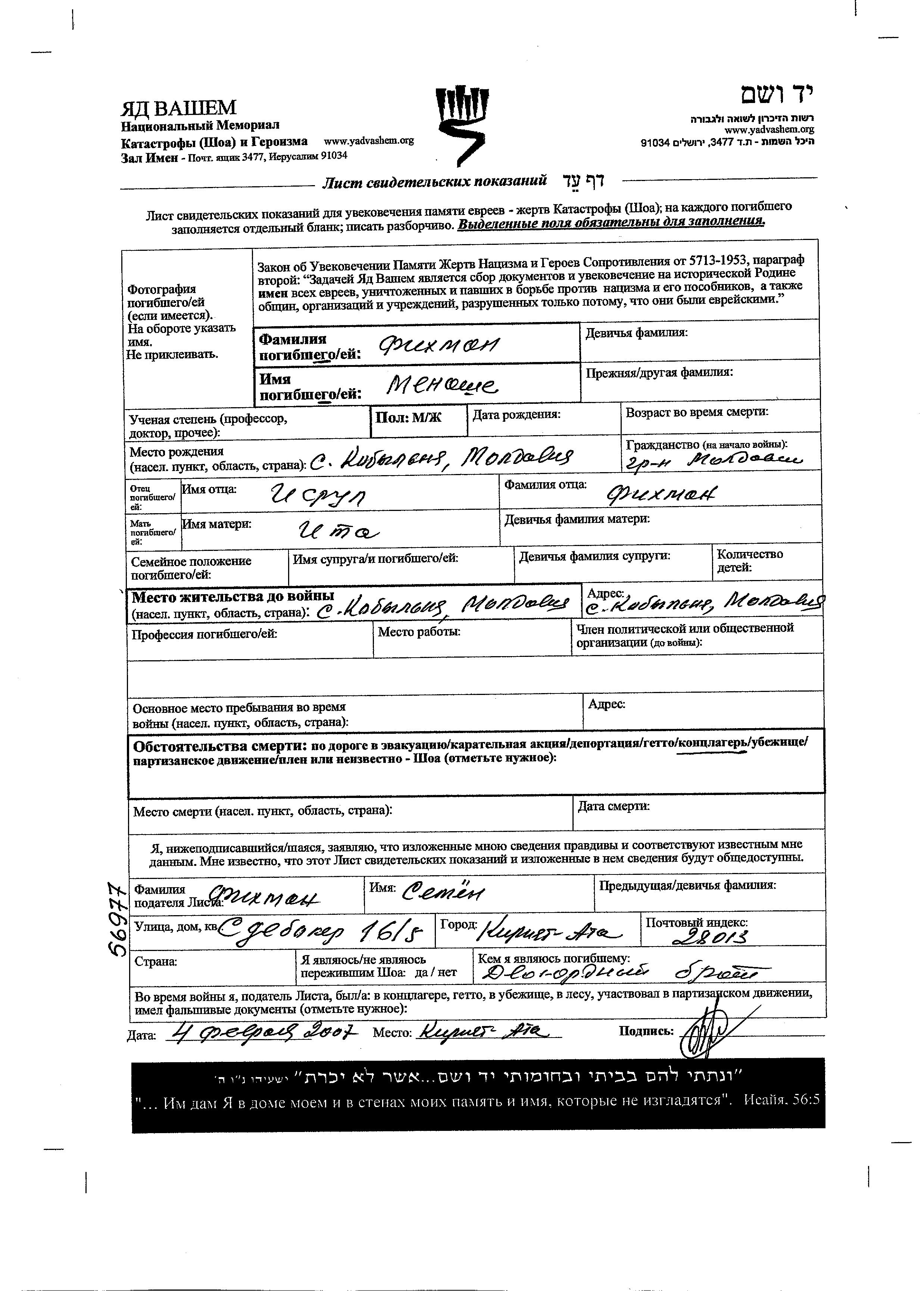 Фихман | Менаше | Кобыльня, Румыния | Лист свидетельских показаний | |