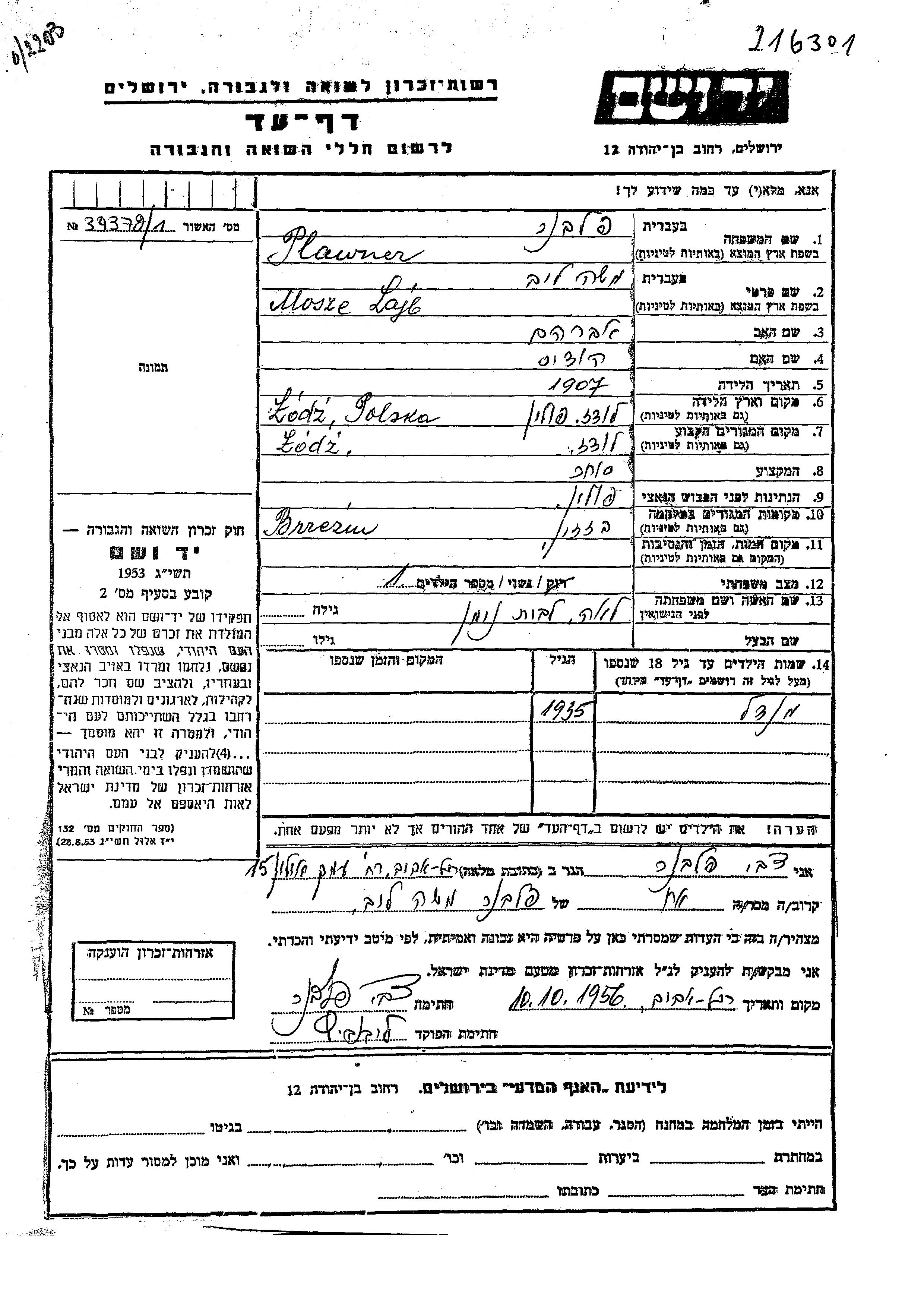 Плавнер Фелабанер Моше Лайб 1907 Лодзь, Польша Лист свидетельских показаний