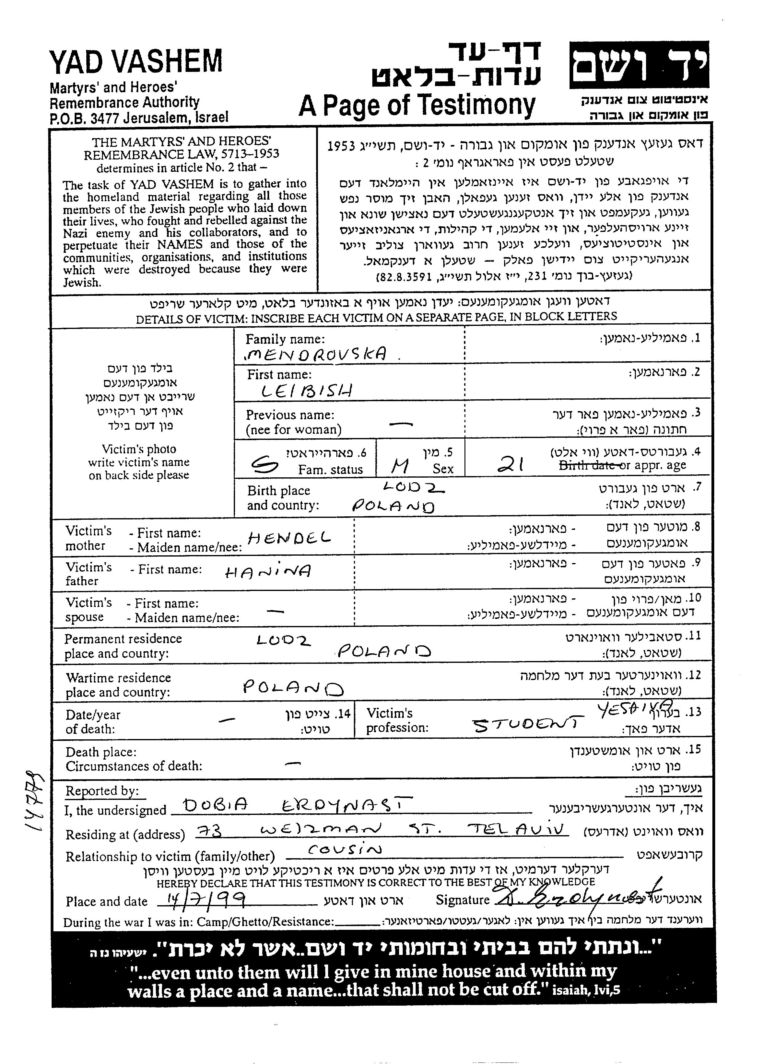 Мендровска Лейбиш Лодзь, Польша Лист свидетельских показаний