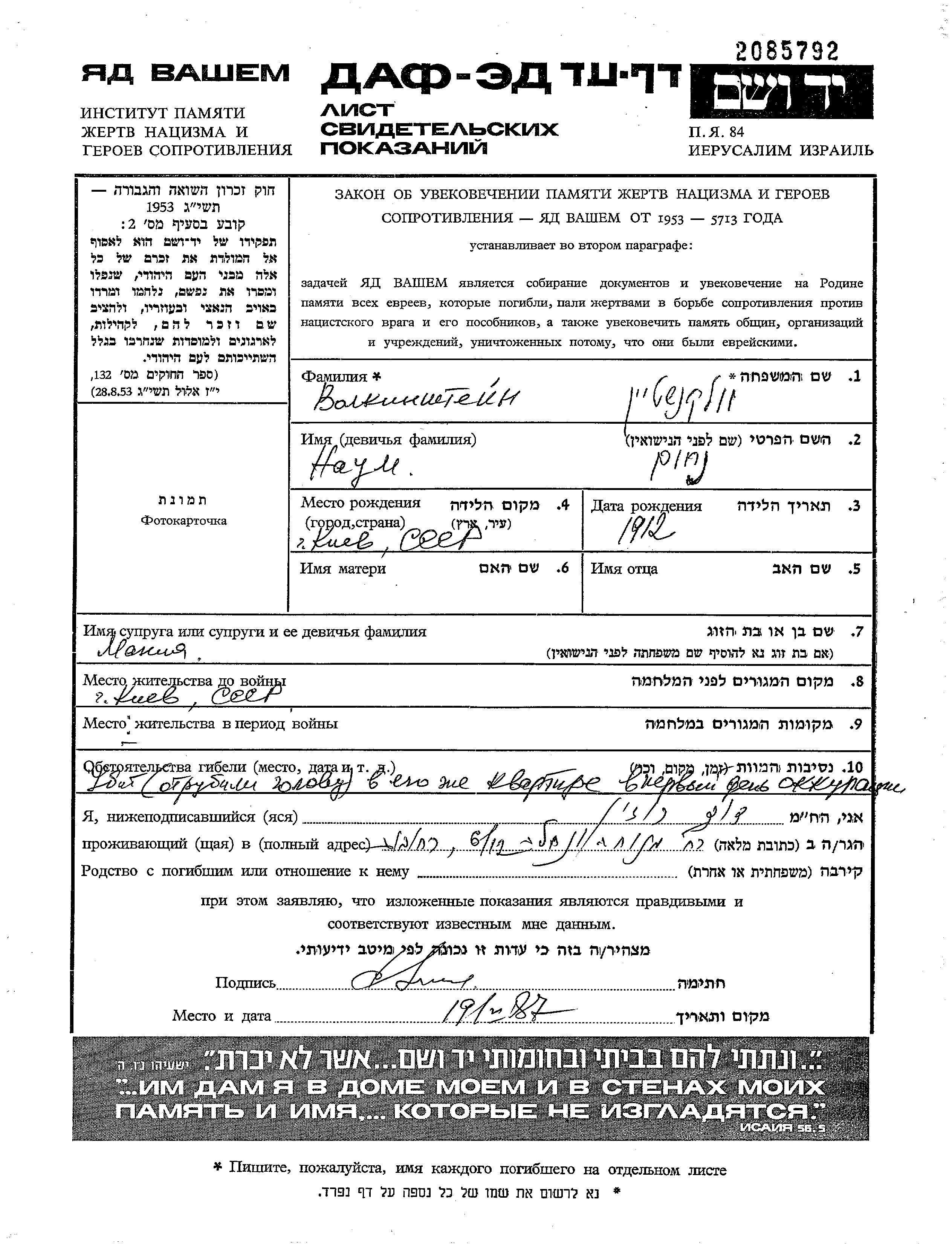 Яд Вашем - Листы свидетельских показаний Мемориального фонда