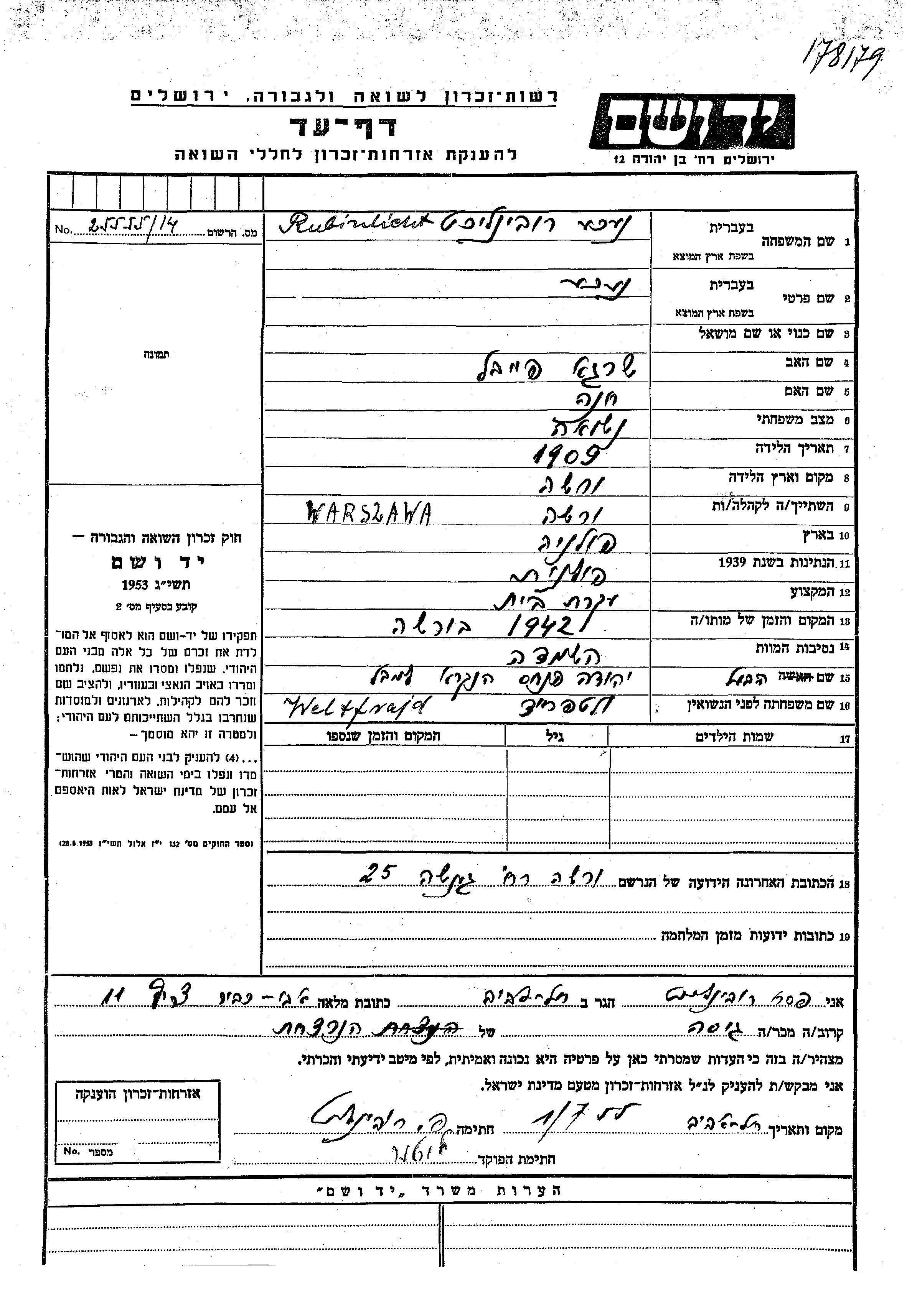 Рубинлихт Нехе 1909 Варшава, Польша Лист свидетельских показаний