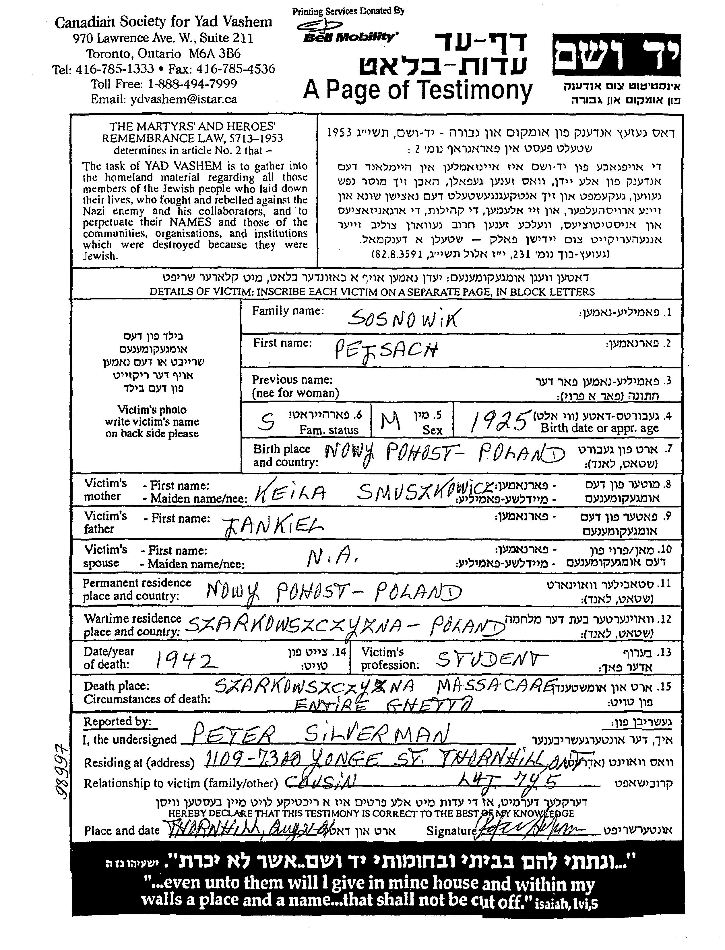 Сосновик Пейсах 1925 Новый Погост, Польша Лист свидетельских показаний