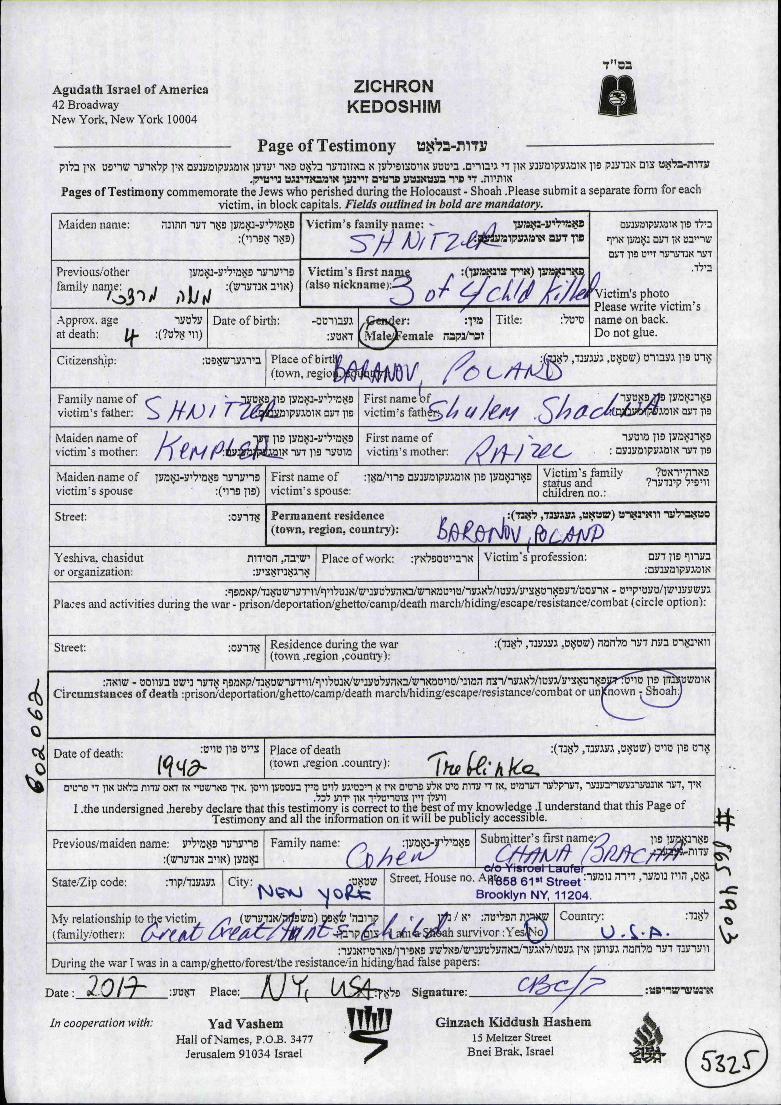 Моше Муля Мордехай Шницер, место рождения: Баранов, Польша. Место жительства до войны: Баранув, Польша.