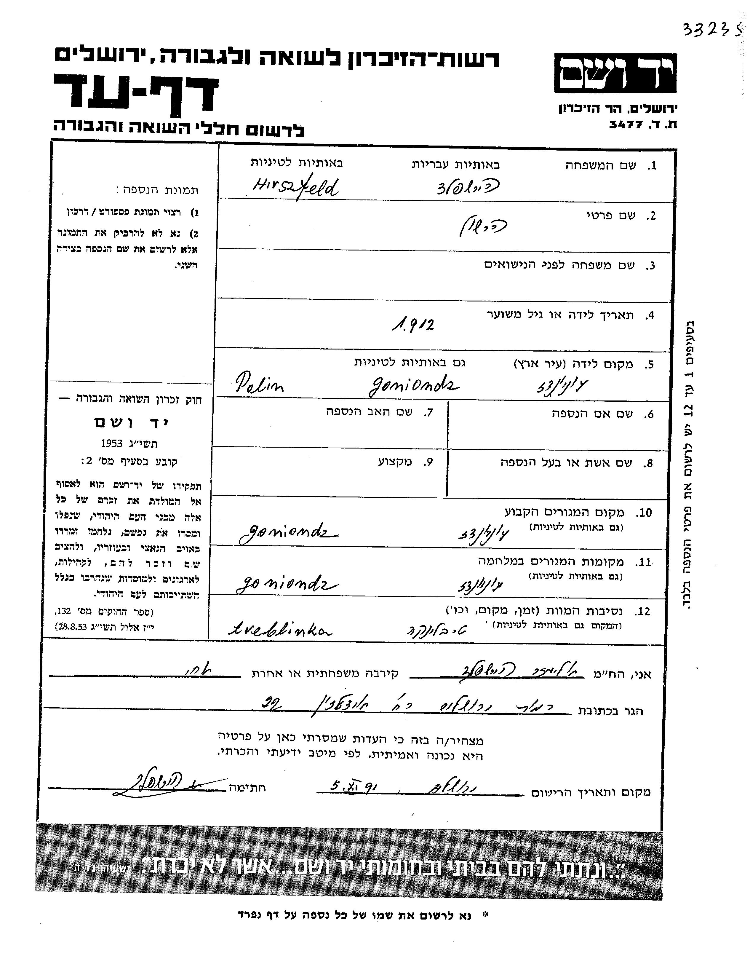 Хиршфельд | Хершл | 1912 | Гонёндз, Польша | Лист свидетельских показаний |