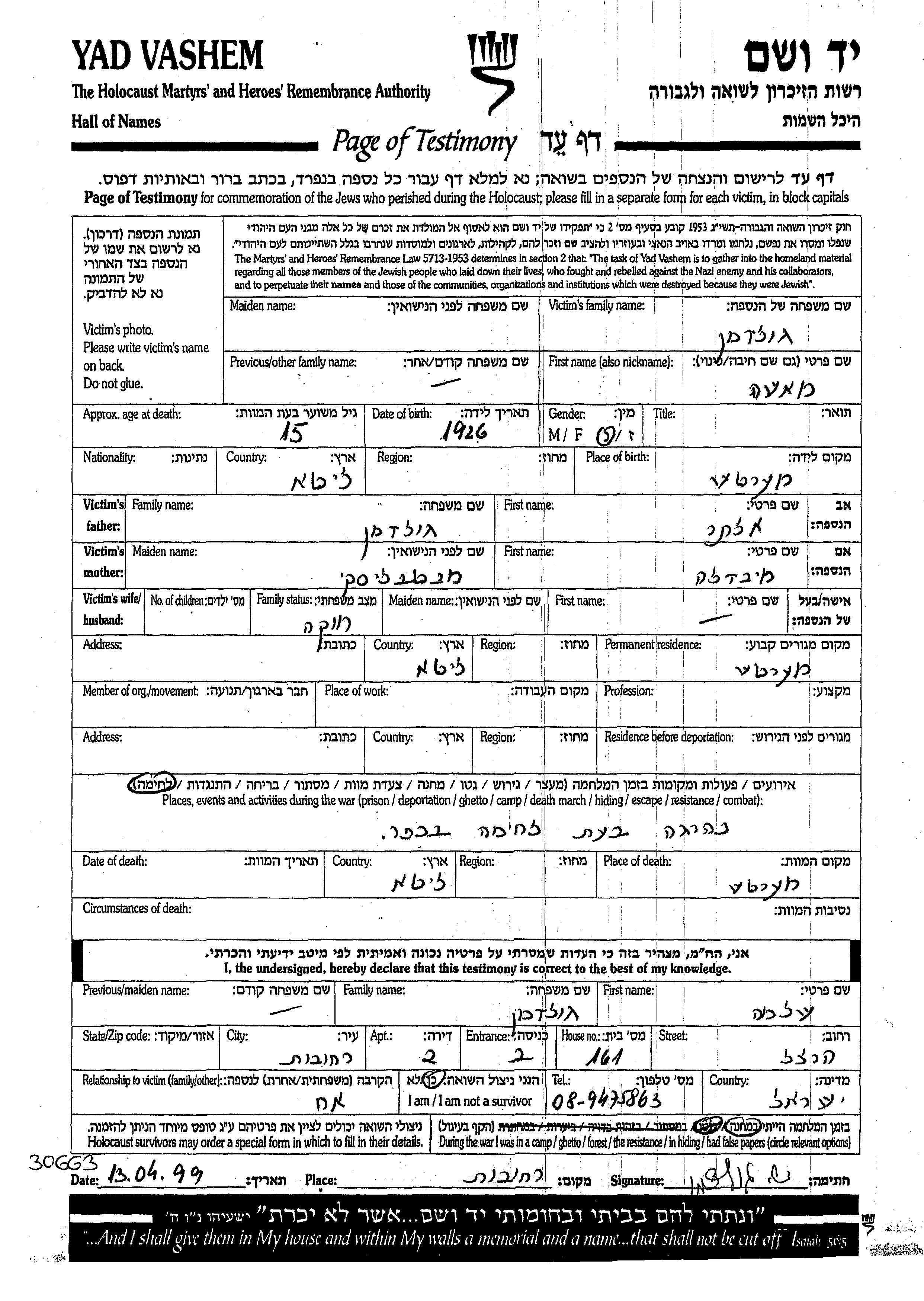 Гольдман Маша 1926 Меркине, Литва Лист свидетельских показаний