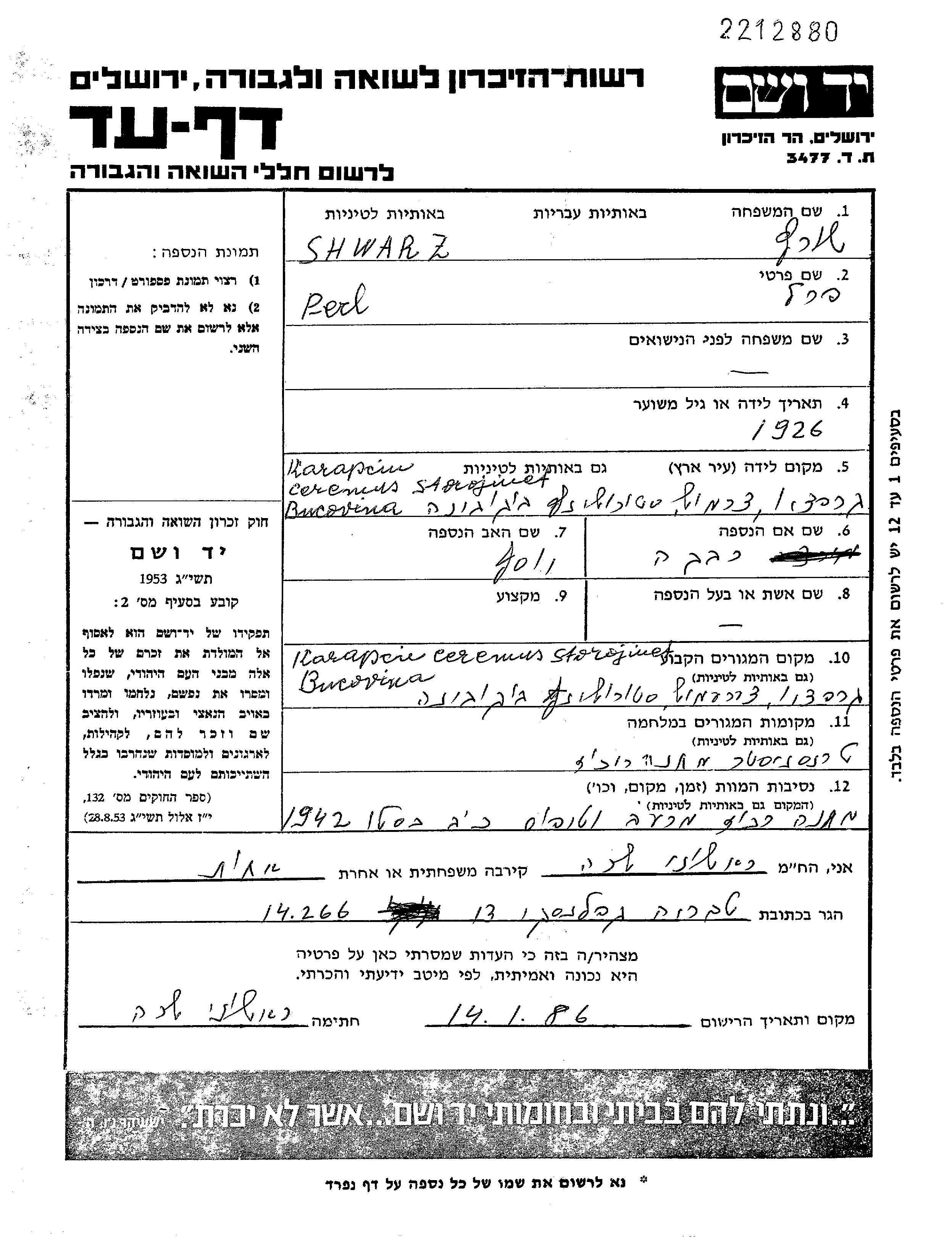 Шварц | Перл | 1926 | Карапчиу пе Черемуш, Румыния | Лист свидетельских показаний |