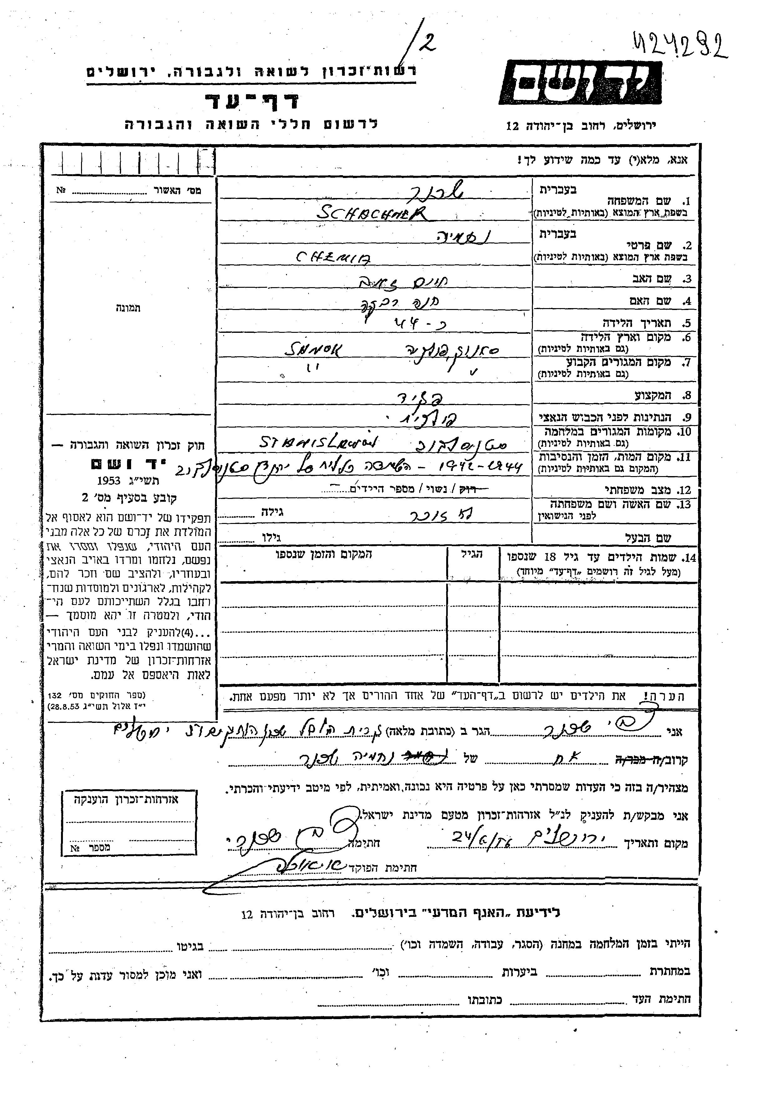 Хемия Шахнер, место рождения: Санок, Польша. Клерк. Место жительства до войны: Санок, Польша.