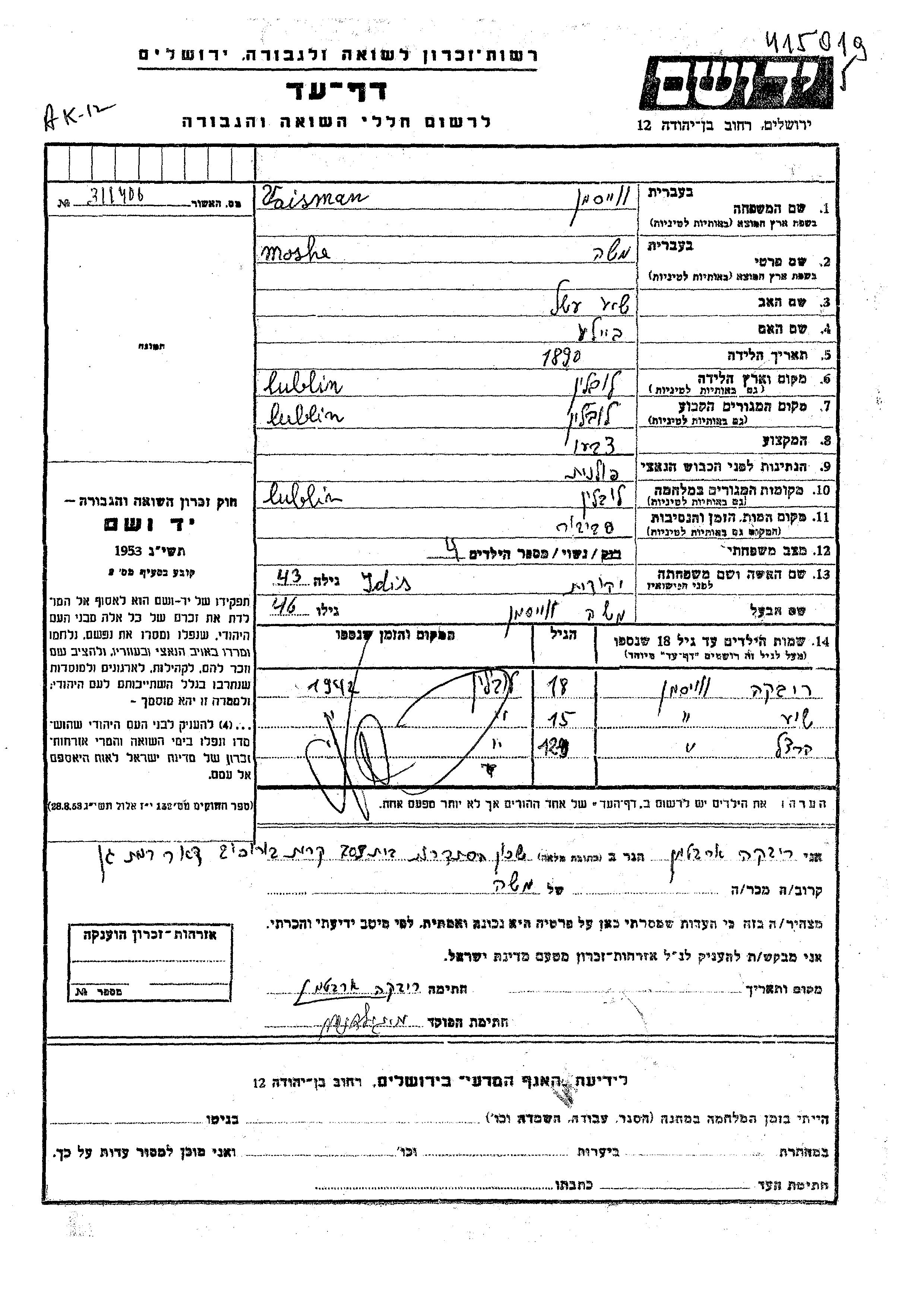 Моше Вайсман, место рождения: Люблин, Польша. Отец: Шие Этель, mать:Бейле. Маляр. Женат / замужем. Место жительства до войны: Люблин, Польша. Место во время войны: Люблин, Польша.