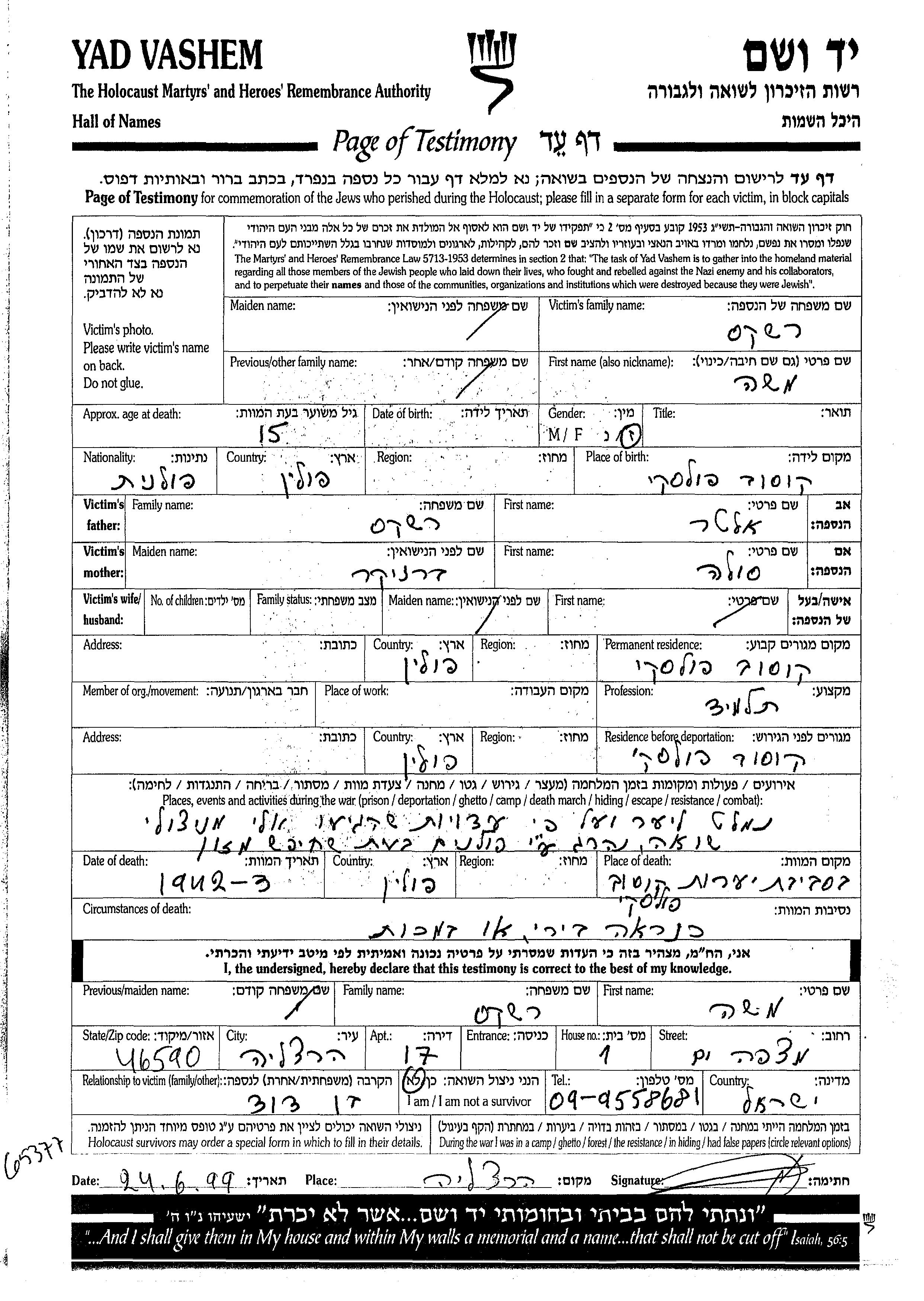 Рашкес | Моше | Косов Полесский, Польша | Лист свидетельских показаний | |