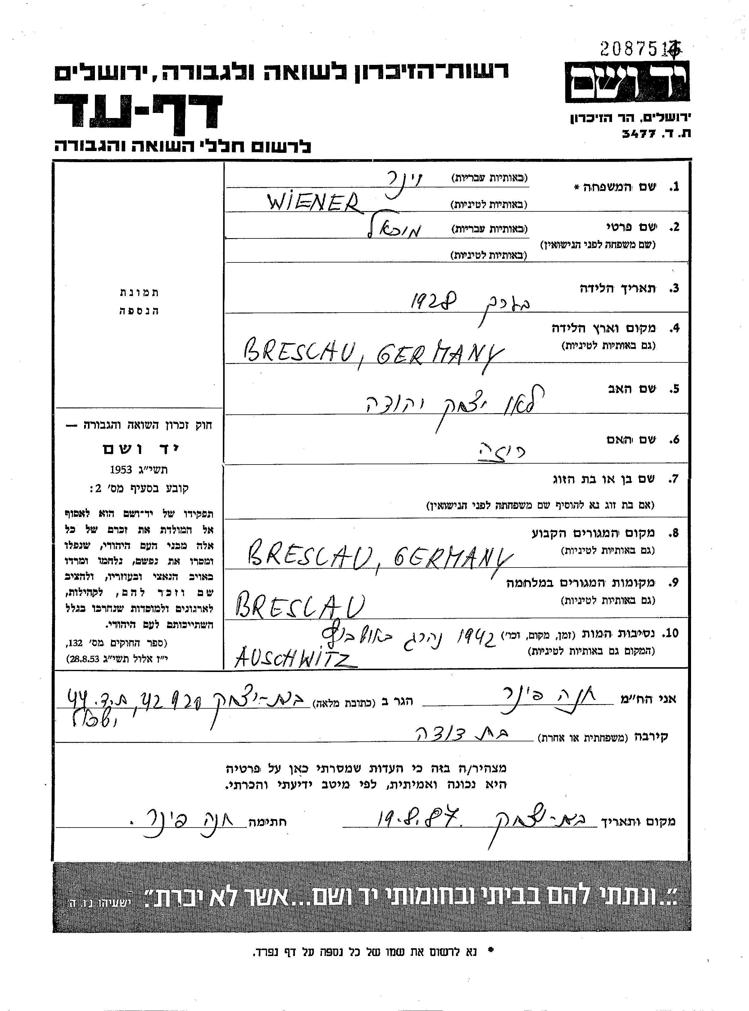 Михаэль Винер, место рождения: Бреслау, Германия. Место жительства до войны: Бреслау, Германия.