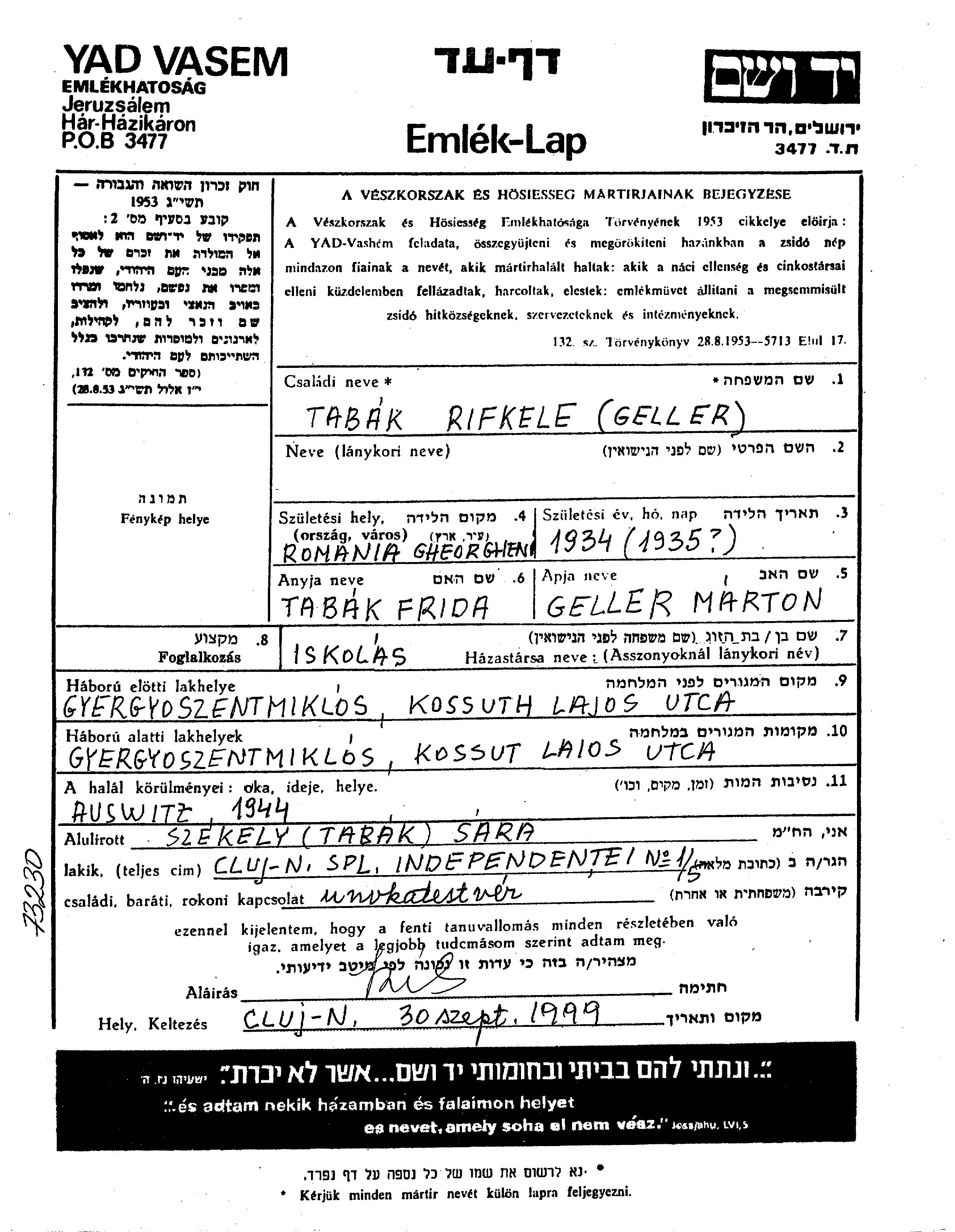 Ривкеле Геллер Табак, девичья фамилия Геллер, место рождения: Георгень, Румыния. Место жительства до войны: Дьердьёсентмиклош, Румыния.