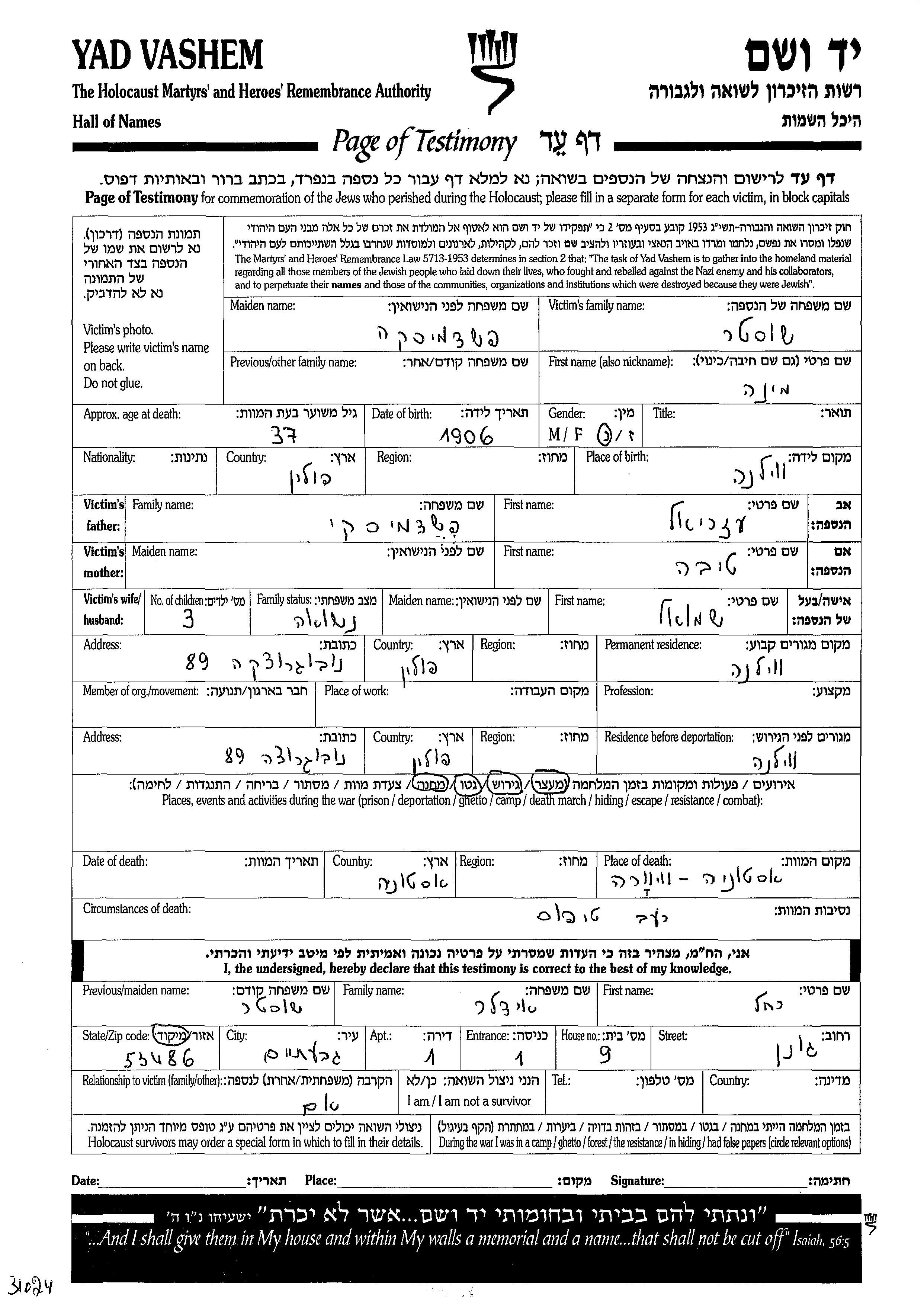 Шустер | Мина | 1906 | Вильно, Польша | Лист свидетельских показаний |