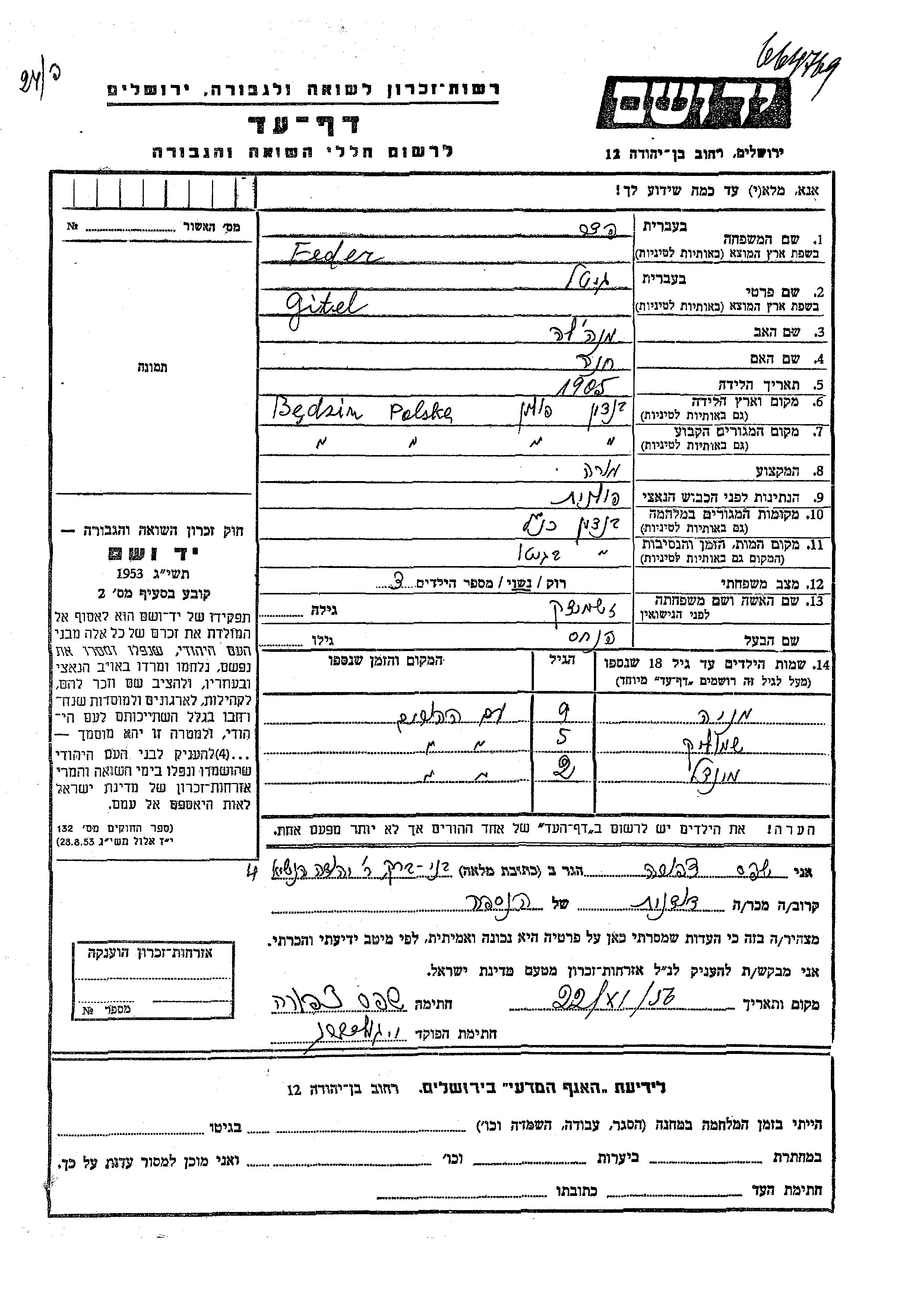 Шмулик Федер. Место жительства до войны: Бендзин, Польша.